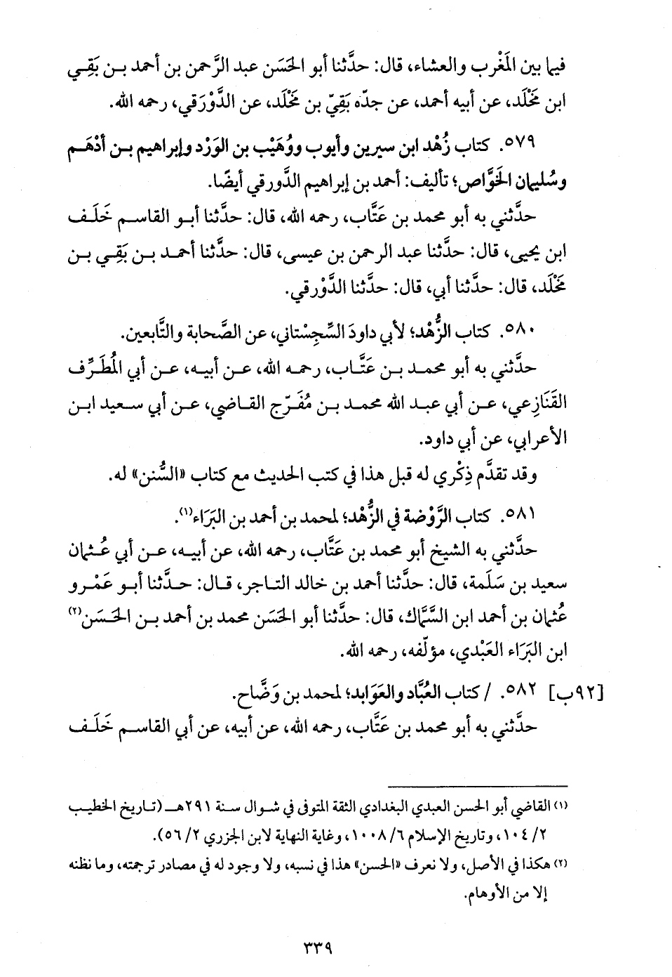 حدّثني به أبو محمد بن عتّاب، رحمه الله، قال: حدّثنا أبو القاسم خلف ابن يحيى، قال: حدّثنا عبد الرحمن بن عيسى، قال: حدّثنا أحمد بن بقي بن مخلد، قال: حدّثنا أبي، قال: حدّثنا الدّورقي.