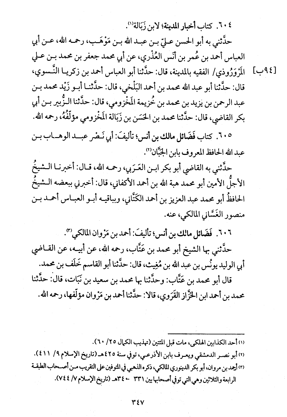حدّثني به أبو الحسن عليّ بن عبد الله بن موهب، رحمه الله، عن أبي العباس أحمد بن عمر بن أنس العذري، عن أبي محمد جعفر بن محمد بن علي المروروذي / الفقيه بالمدينة، قال: حدّثنا أبو العباس أحمد بن زكريا النّسوي، قال: حدّثنا أبو عبد الله محمد بن أحمد البلخي، قال: حدّثنا أبو زيد محمد بن عبد الرحمن بن يزيد بن محمد بن خزيمة المخزومي، قال: حدّثنا الزّبير بن أبي بكر القاضي، قال: حدّثنا محمد بن الحسن بن زبالة المخزومي مؤلّفه، رحمه الله.