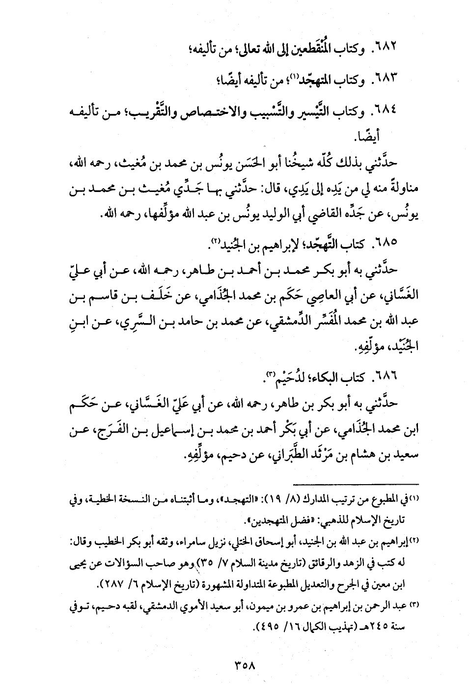 حدّثني به أبو بكر محمد بن أحمد بن طاهر، رحمه الله، عن أبي عليّ الغسّاني، عن أبي العاصي حكم بن محمد الجذامي، عن خلف بن قاسم بن عبد الله بن محمد المفسّر الدّمشقي، عن محمد بن حامد بن السّري، عن ابن الجنيد، مؤلّفه.