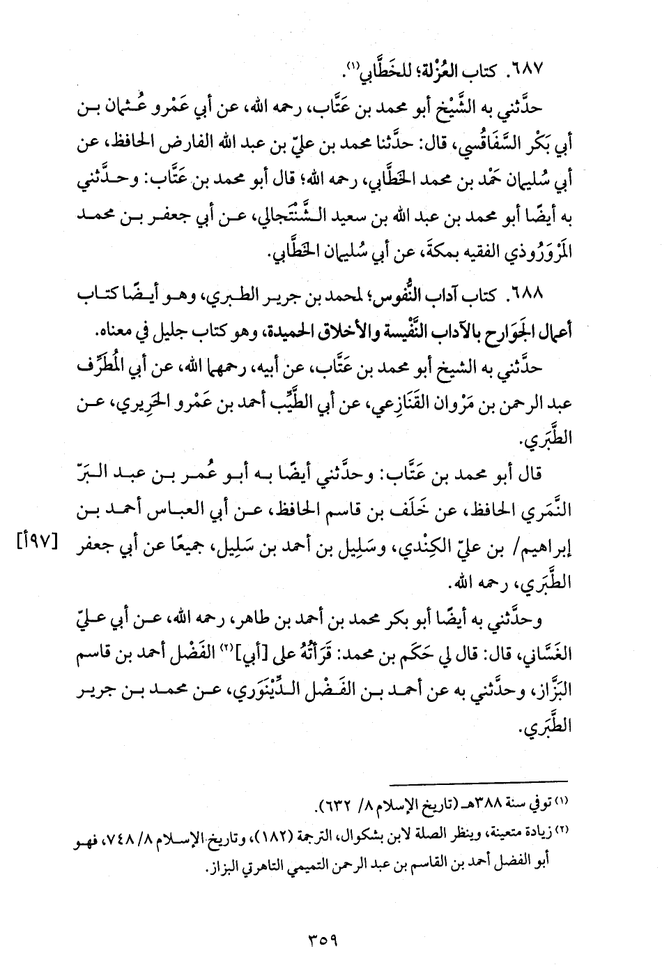 حدّثني به الشيخ أبو محمد بن عتّاب، عن أبيه، رحمهما الله، عن أبي المطرّف عبد الرحمن بن مروان القنازعي، عن أبي الطّيّب أحمد بن عمرو الحريري، عن الطّبري.