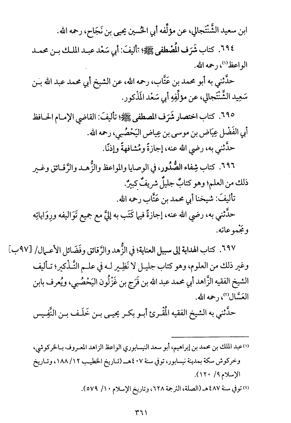 696. كتاب شفاء الصّدور، في الوصايا والمواعظ والزّهد والرّقائق وغير ذلك من العلم؛ وهو كتاب جليل شريف كبير.