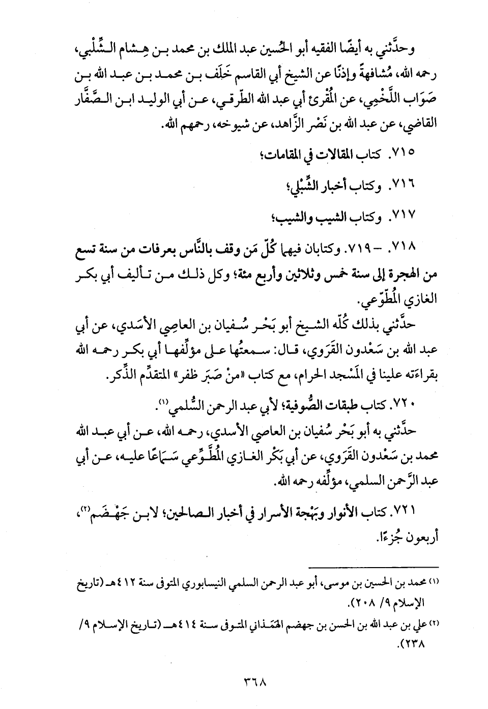718. - 719. وكتابان فيهما كلّ من وقف بالنّاس بعرفات من سنة تسع من الهجرة إلى سنة خمس وثلاثين وأربع مئة؛