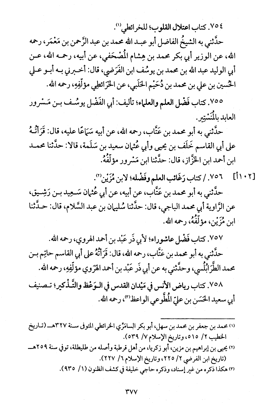حدّثني به الشيخ الفاضل أبو عبد الله محمد بن عبد الرّحمن بن معمر، رحمه الله، عن الوزير أبي بكر محمد بن هشام المصحفي، عن أبيه، رحمه الله، عن أبي الوليد عبد الله بن محمد بن يوسف ابن الفرضي، قال: أخبرني به أبو علي الحسين بن علي بن محمد بن دحيم الحلبي، عن الخرائطي مؤلّفه، رحمه الله.