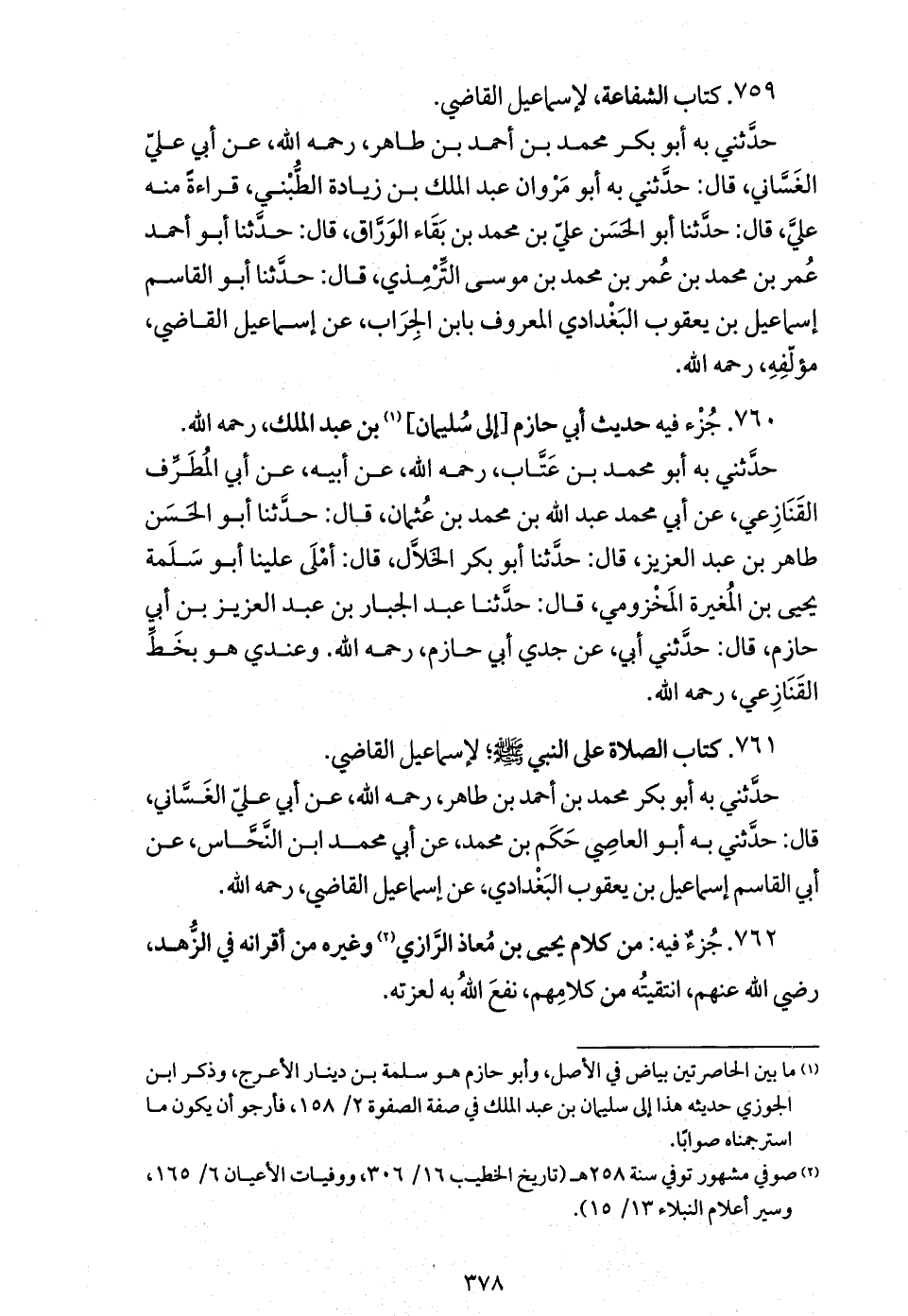 حدّثني به أبو محمد بن عتّاب، رحمه الله، عن أبيه، عن أبي المطرّف القنازعي، عن أبي محمد عبد الله بن محمد بن عثمان، قال: حدّثنا أبو الحسن طاهر بن عبد العزيز، قال: حدّثنا أبو بكر الخلاّل، قال: أملى علينا أبو سلمة يحيى بن المغيرة المخزومي، قال: حدّثنا عبد الجبار بن عبد العزيز بن أبي حازم، قال: حدّثني أبي، عن جدي أبي حازم، رحمه الله. وعندي هو بخطّ القنازعي، رحمه الله.