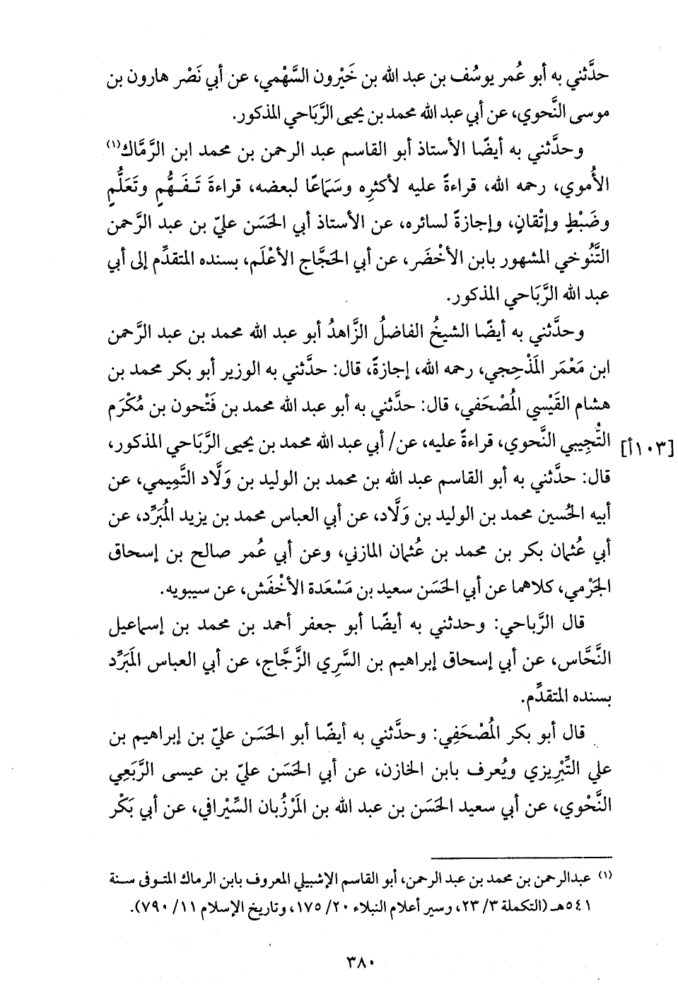 وحدّثني به أيضا الشيخ الفاضل الزّاهد أبو عبد الله محمد بن عبد الرّحمن ابن معمر المذحجي، رحمه الله، إجازة، قال: حدّثني به الوزير أبو بكر محمد بن هشام القيسي المصحفي، قال: حدّثني به أبو عبد الله محمد بن فتحون بن مكرم التّجيبي النّحوي، قراءة عليه، عن / أبي عبد الله محمد بن يحيى الرّباحي المذكور، قال: حدّثني به أبو القاسم عبد الله بن محمد بن الوليد بن ولاّد التّميمي، عن أبيه الحسين محمد بن الوليد بن ولاّد، عن أبي العباس محمد بن يزيد المبرّد، عن أبي عثمان بكر بن محمد بن عثمان المازني، وعن أبي عمر صالح بن إسحاق الجرمي، كلاهما عن أبي الحسن سعيد بن مسعدة الأخفش، عن سيبويه.