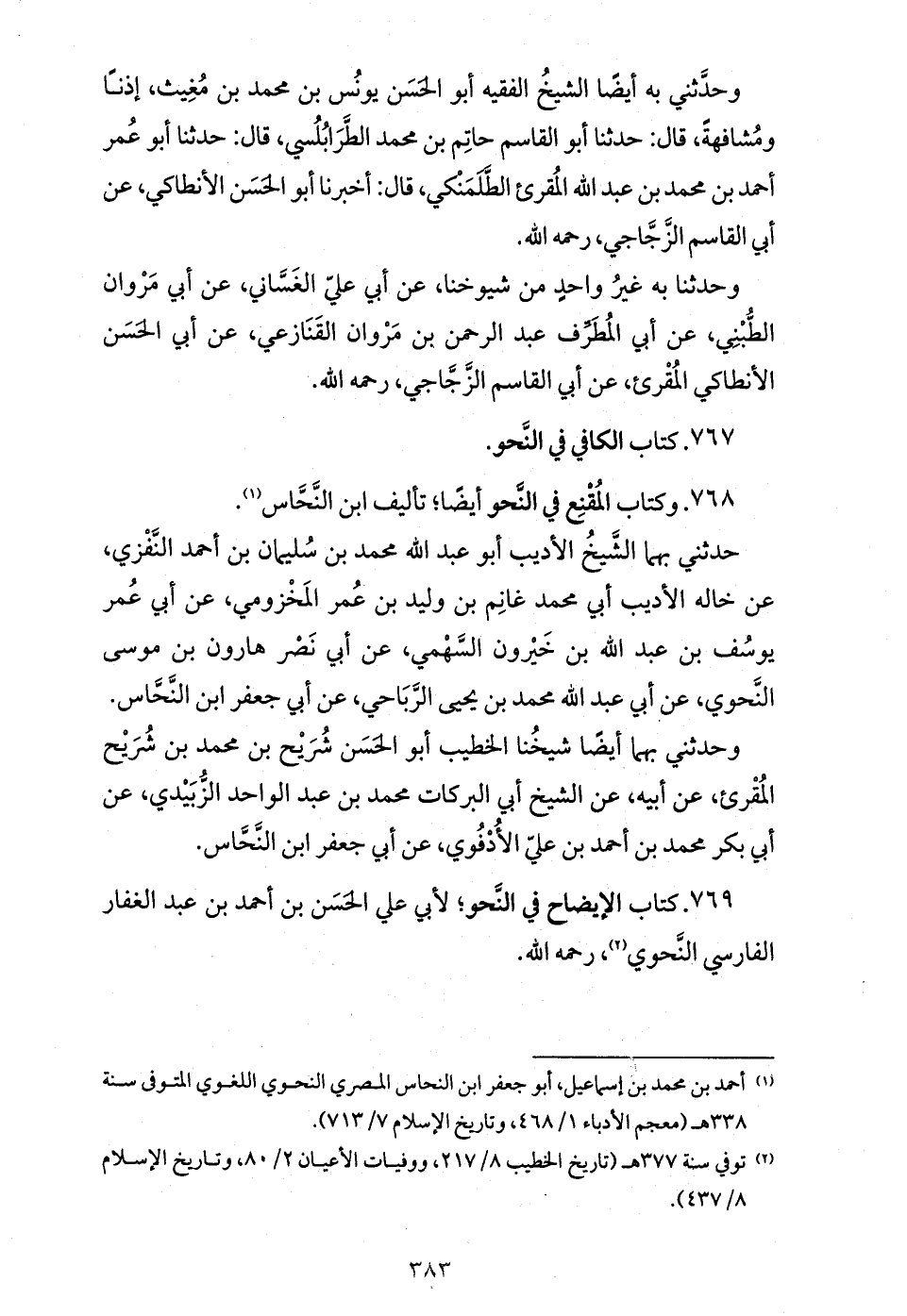 حدثني بهما الشّيخ الأديب أبو عبد الله محمد بن سليمان بن أحمد النّفزي، عن خاله الأديب أبي محمد غانم بن وليد بن عمر المخزومي، عن أبي عمر يوسف بن عبد الله بن خيرون السّهمي، عن أبي نصر هارون بن موسى النّحوي، عن أبي عبد الله محمد بن يحيى الرّباحي، عن أبي جعفر ابن النّحّاس.