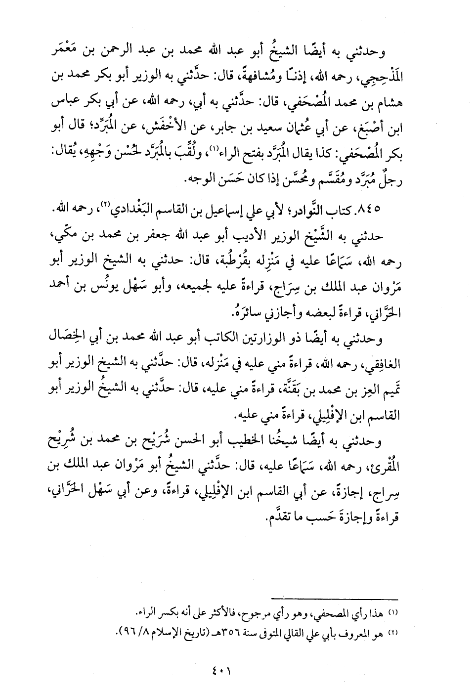 وحدثني به أيضا الشيخ أبو عبد الله محمد بن عبد الرحمن بن معمر المذحجي، رحمه الله، إذنا ومشافهة، قال: حدّثني به الوزير أبو بكر محمد بن هشام بن محمد المصحفي، قال: حدّثني به أبي، رحمه الله، عن أبي بكر عباس ابن أصبغ، عن أبي عثمان سعيد بن جابر، عن الأخفش، عن المبرّد؛ قال أبو بكر المصحفي: كذا يقال المبرّد بفتح الراء (¬1)، ولقّب بالمبرّد لحسن وجهه، يقال: رجل مبرّد ومقسّم ومحسّن إذا كان حسن الوجه.