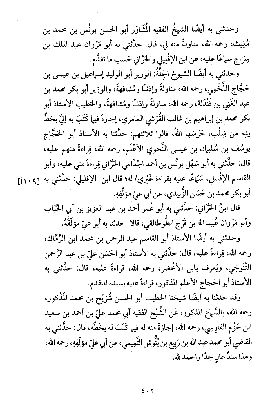 وحدثني به أيضا الأستاذ أبو القاسم عبد الرحمن بن محمد ابن الرّمّاك، رحمه الله، قراءة عليه، قال: حدّثني به الأستاذ أبو الحسن عليّ بن عبد الرّحمن التّنوخي، ويعرف بابن الأخضر، رحمه الله، قراءة عليه، قال: حدّثني به الأستاذ أبو الحجاج الأعلم المذكور، قراءة عليه بسنده المتقدم.