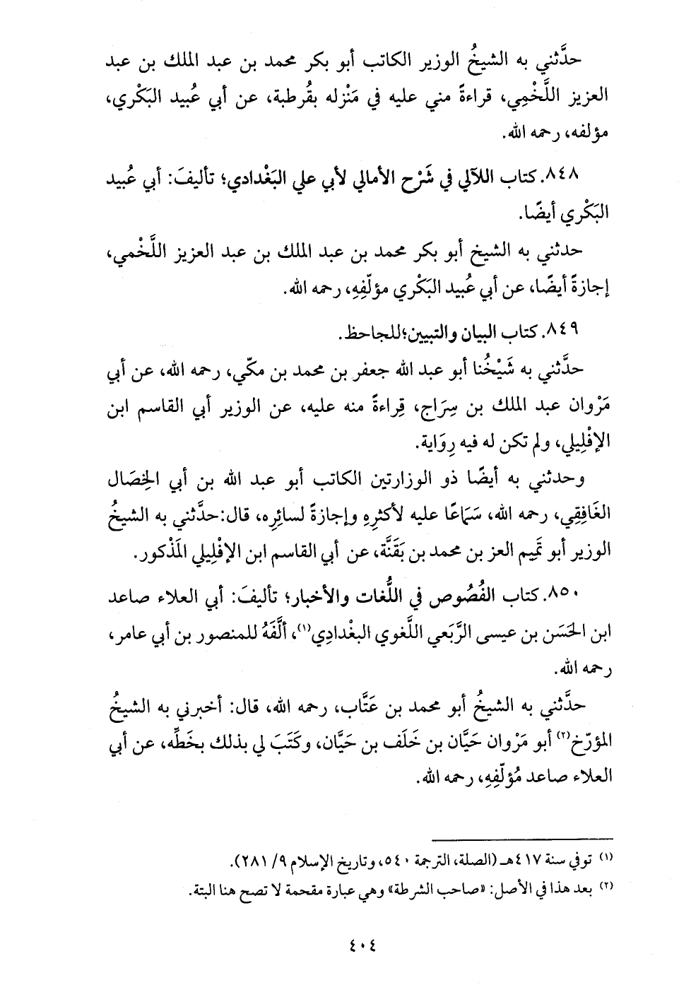 حدّثني به الشيخ أبو محمد بن عتّاب، رحمه الله، قال: أخبرني به الشيخ المؤرّخ (¬2) أبو مروان حيّان بن خلف بن حيّان، وكتب لي بذلك بخطّه، عن أبي العلاء صاعد مؤلّفه، رحمه الله.
