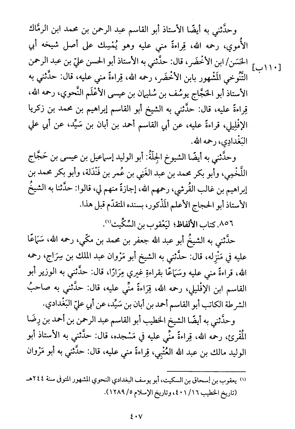 حدّثني به الشيخ أبو عبد الله جعفر بن محمد بن مكّي، رحمه الله، سماعا عليه في منزله، قال: حدّثني به الشيخ أبو مروان عبد الملك بن سراج، رحمه الله، قراءة مني عليه وسماعا بقراءة غيري مرارا، قال: حدّثني به الوزير أبو القاسم ابن الإفليلي، رحمه الله، قراءة منّي عليه، قال: حدّثني به صاحب الشرطة الكاتب أبو القاسم أحمد بن أبان بن سيّد، عن أبي عليّ البغدادي.
