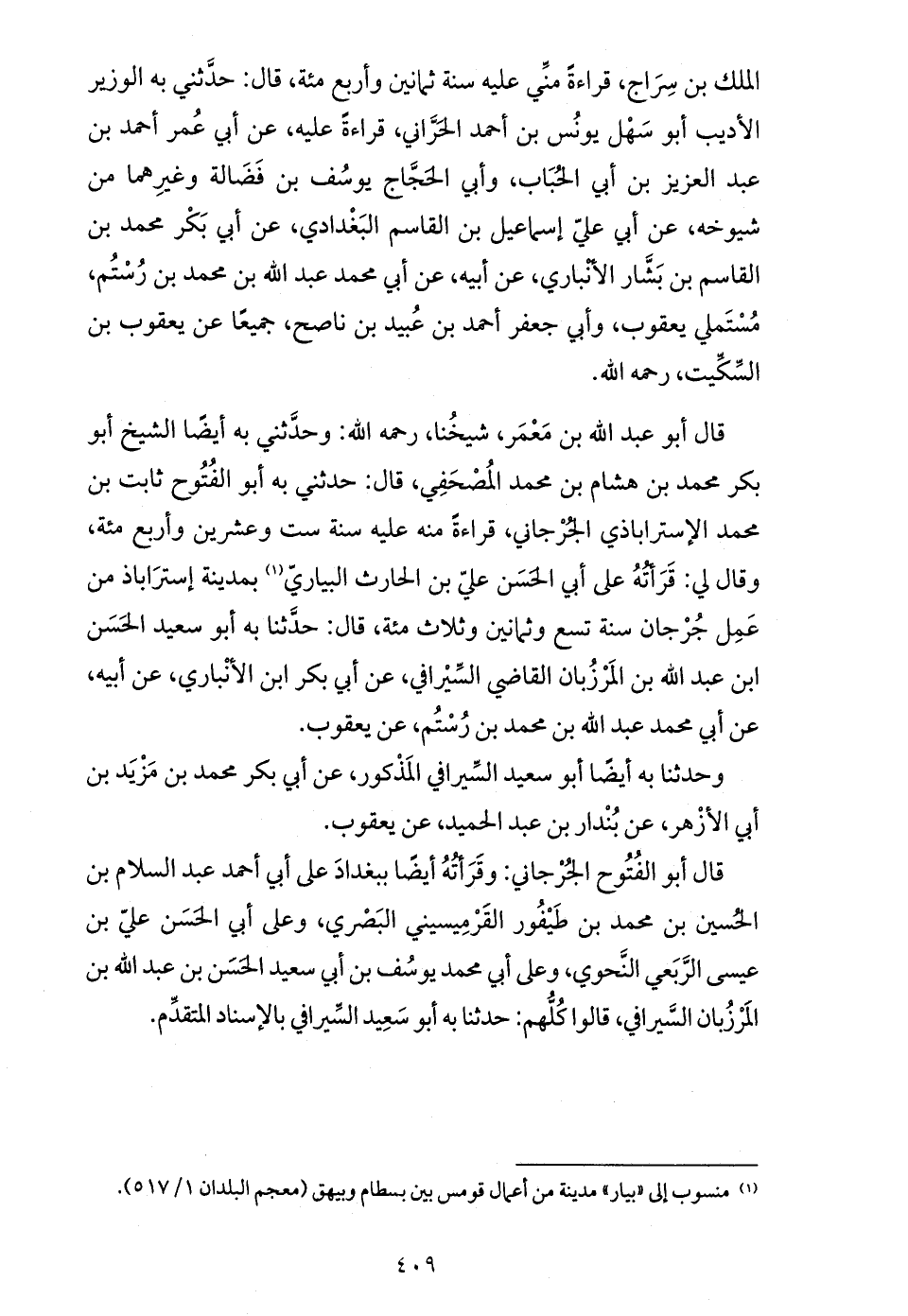 قال أبو الفتوح الجرجاني: وقرأته أيضا ببغداد على أبي أحمد عبد السّلام بن الحسين بن محمد بن طيفور القرميسيني البصري، وعلى أبي الحسن عليّ بن عيسى الرّبعي النّحوي، وعلى أبي محمد يوسف بن أبي سعيد الحسن بن عبد الله بن المرزبان السّيرافي، قالوا كلّهم: حدثنا به أبو سعيد السّيرافي بالإسناد المتقدّم.