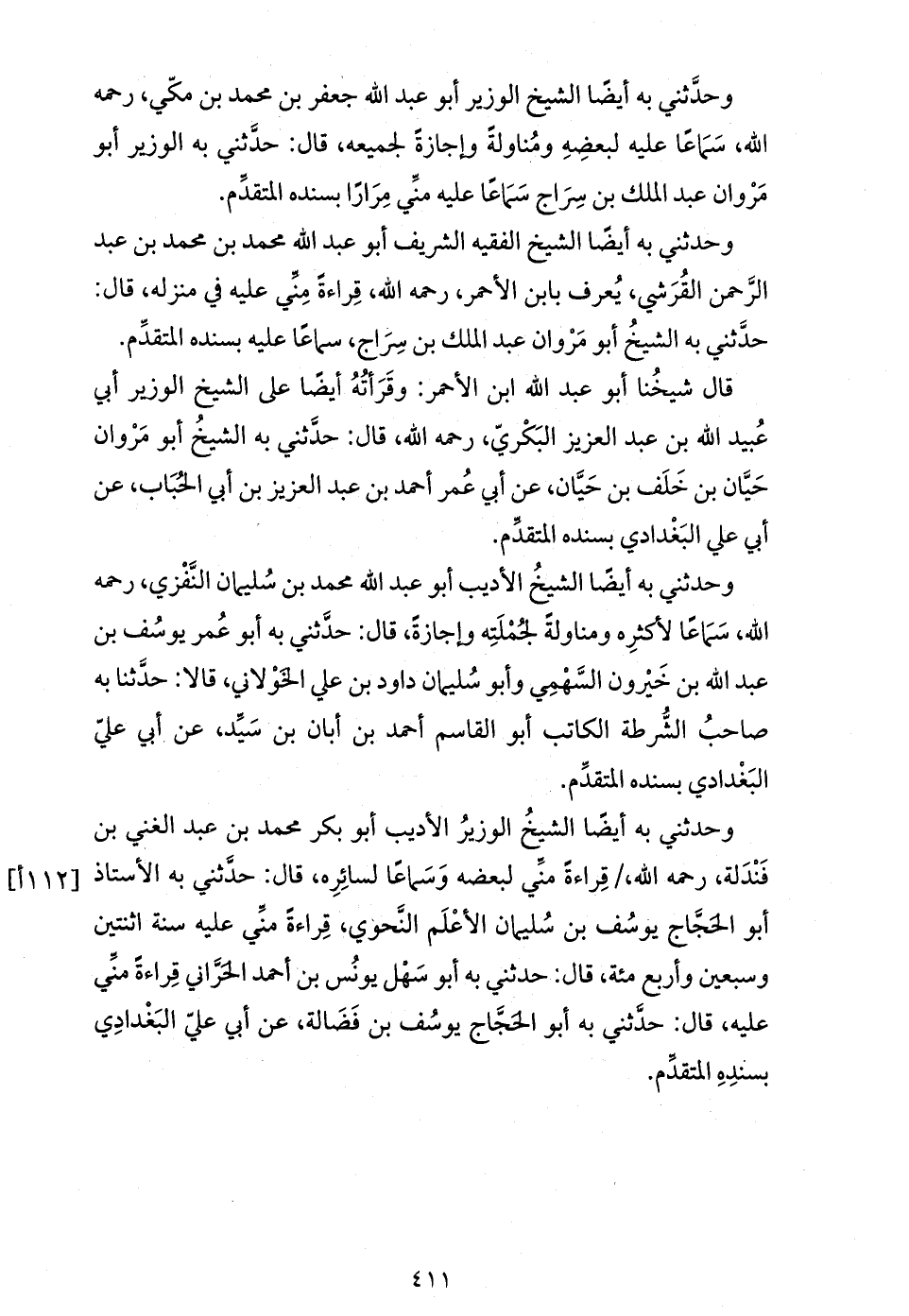 وحدثني به أيضا الشيخ الوزير الأديب أبو بكر محمد بن عبد الغني بن فندلة، رحمه الله، / قراءة منّي لبعضه وسماعا لسائره، قال: حدّثني به الأستاذ أبو الحجّاج يوسف بن سليمان الأعلم النّحوي، قراءة منّي عليه سنة اثنتين وسبعين وأربع مئة، قال: حدثني به أبو سهل يونس بن أحمد الحرّاني قراءة منّي عليه، قال: حدّثني به أبو الحجّاج يوسف بن فضالة، عن أبي عليّ البغدادي بسنده المتقدّم.