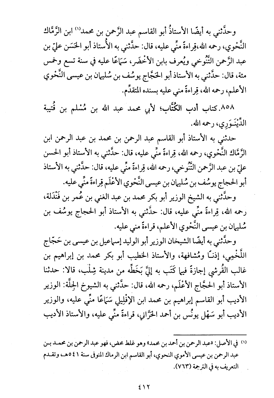 حدثني به الأستاذ أبو القاسم عبد الرحمن بن محمد بن عبد الرحمن ابن الرّمّاك النّحوي، رحمه الله، قراءة منّي عليه، قال: حدّثني به الأستاذ أبو الحسن عليّ بن عبد الرّحمن التّنوخي، رحمه الله، قراءة منّي عليه، قال: حدّثني به الأستاذ أبو الحجاج يوسف بن سليمان بن عيسى النّحوي الأعلم قراءة منّي عليه.