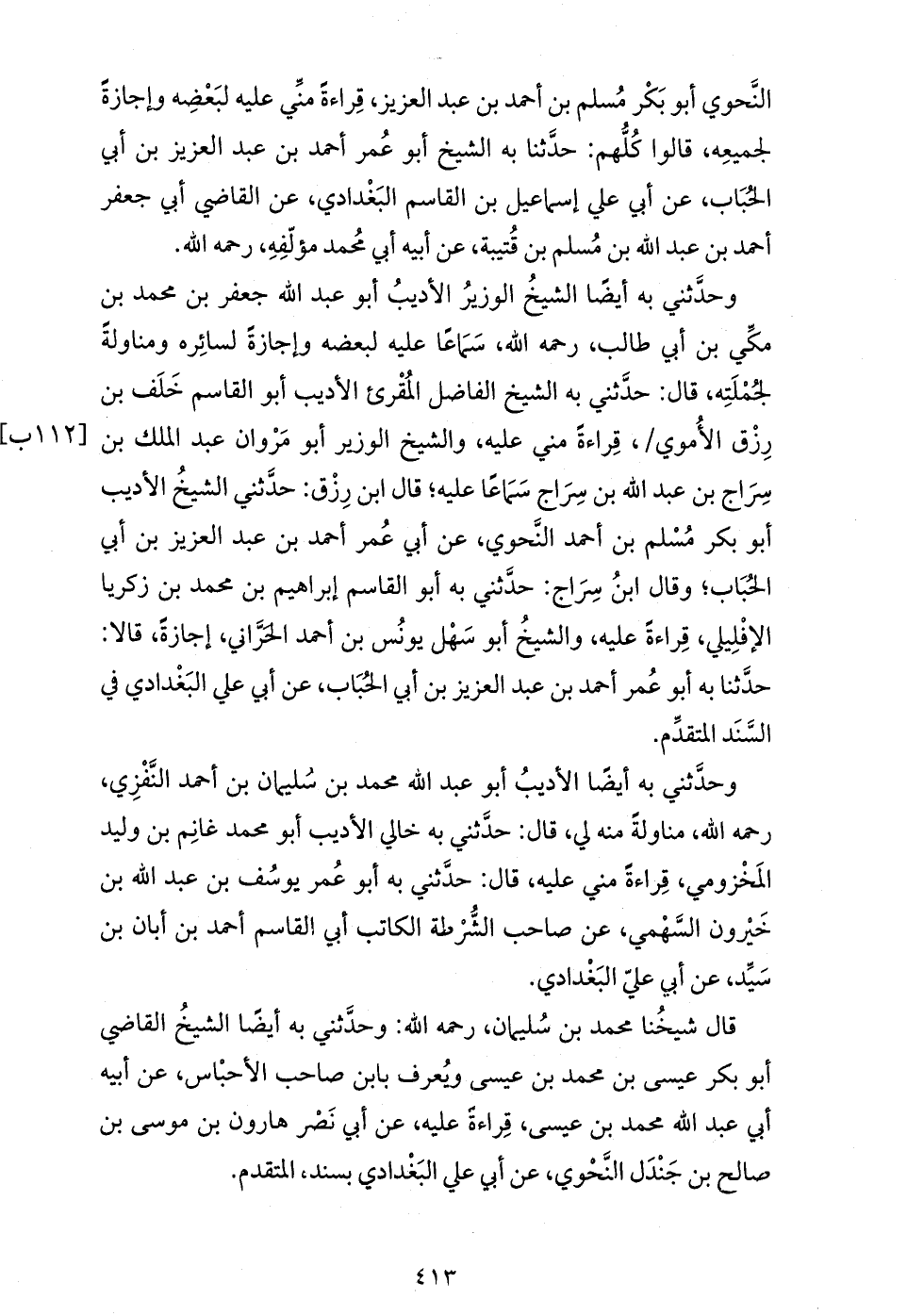 النّحوي أبو بكر مسلم بن أحمد بن عبد العزيز، قراءة منّي عليه لبعضه وإجازة لجميعه، قالوا كلّهم: حدّثنا به الشيخ أبو عمر أحمد بن عبد العزيز بن أبي الحباب، عن أبي علي إسماعيل بن القاسم البغدادي، عن القاضي أبي جعفر أحمد بن عبد الله بن مسلم بن قتيبة، عن أبيه أبي محمد مؤلّفه، رحمه الله.
