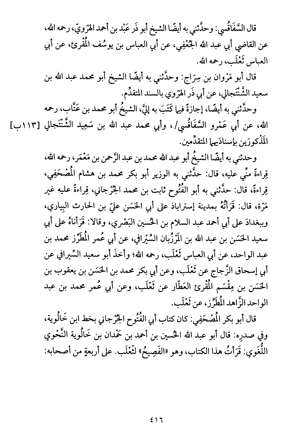 وحدثني به أيضا الشيخ أبو عبد الله محمد بن عبد الرّحمن بن معمر، رحمه الله، قراءة منّي عليه، قال: حدّثني به الوزير أبو بكر محمد بن هشام المصحفي، قراءة، قال: حدّثني به أبو الفتوح ثابت بن محمد الجرجاني، قراءة عليه غير مرّة، قال: قرأته بمدينة إستراباذ على أبي الحسن عليّ بن الحارث البياري، وببغداد على أبي أحمد عبد السّلام بن الحسين البصري، وقالا: قرأناه على أبي سعيد الحسن بن عبد الله بن المرزبان السّيرافي، عن أبي عمر المطرّز محمد بن عبد الواحد، عن أبي العباس ثعلب، رحمه الله؛ وأخذ أبو سعيد السّيرافي عن أبي إسحاق الزّجاج عن ثعلب، وعن أبي بكر محمد بن الحسن بن يعقوب بن الحسن بن مقسم المقرئ العطّار عن ثعلب، وعن أبي عمر محمد بن عبد الواحد الزّاهد المطرّز، عن ثعلب.