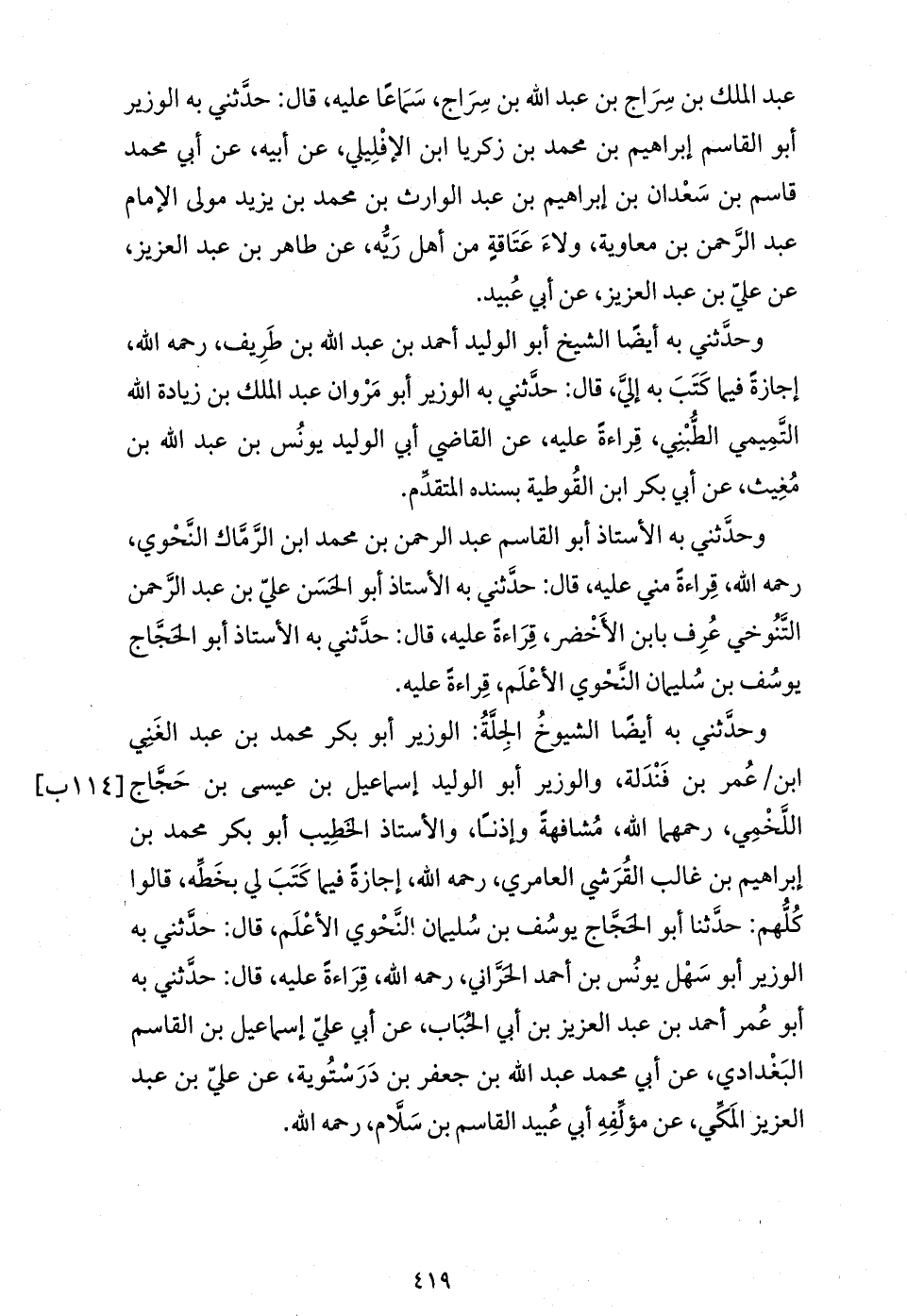 وحدّثني به أيضا الشيوخ الجلّة: الوزير أبو بكر محمد بن عبد الغني ابن / عمر بن فندلة، والوزير أبو الوليد إسماعيل بن عيسى بن حجّاج اللّخمي، رحمهما الله، مشافهة وإذنا، والأستاذ الخطيب أبو بكر محمد بن إبراهيم بن غالب القرشي العامري، رحمه الله، إجازة فيما كتب لي بخطّه، قالوا كلّهم: حدّثنا أبو الحجّاج يوسف بن سليمان النّحوي الأعلم، قال: حدّثني به الوزير أبو سهل يونس بن أحمد الحرّاني، رحمه الله، قراءة عليه، قال: حدّثني به أبو عمر أحمد بن عبد العزيز بن أبي الحباب، عن أبي عليّ إسماعيل بن القاسم البغدادي، عن أبي محمد عبد الله بن جعفر بن درستوية، عن عليّ بن عبد العزيز المكّي، عن مؤلّفه أبي عبيد القاسم بن سلاّم، رحمه الله.