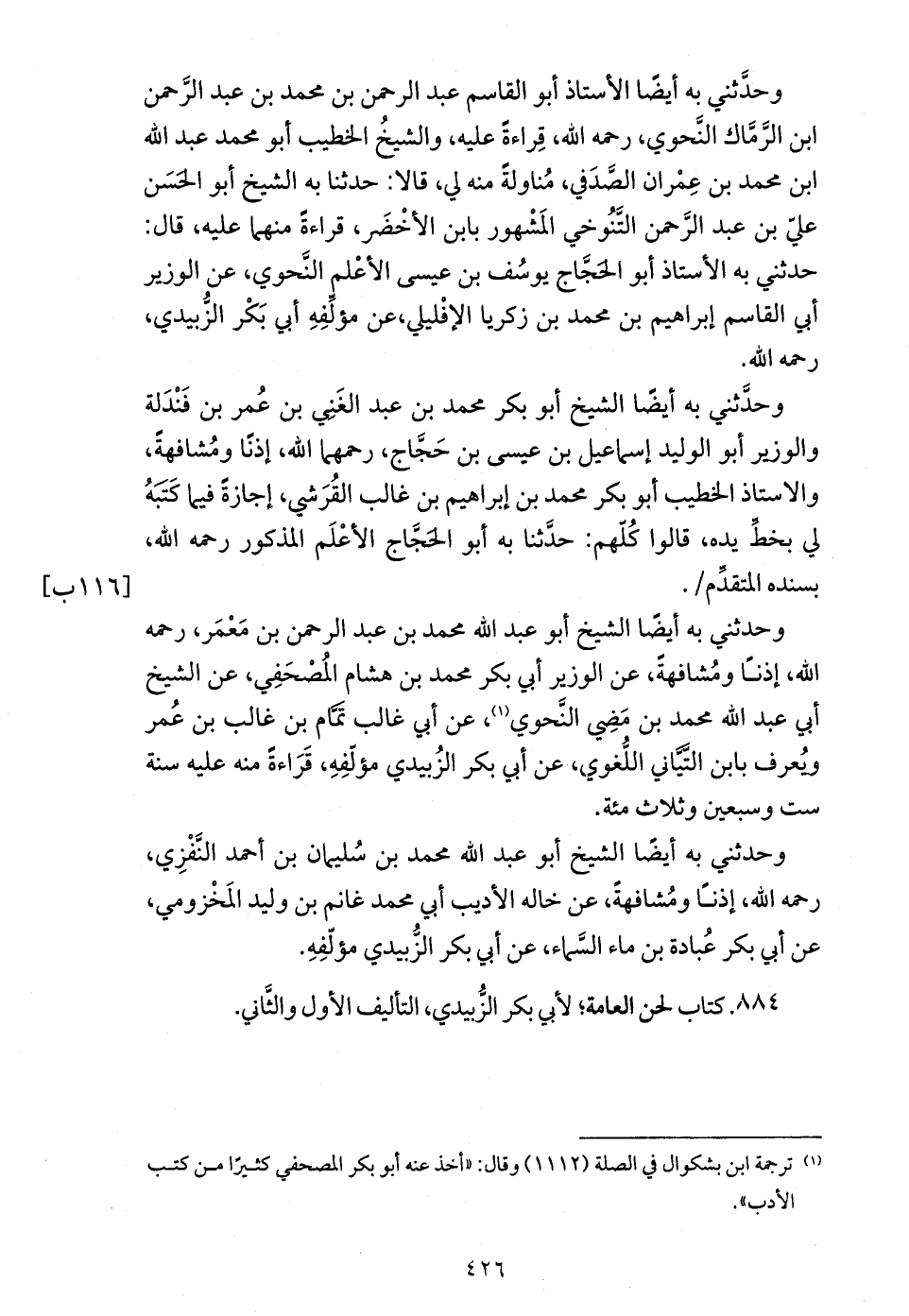 وحدّثني به أيضا الأستاذ أبو القاسم عبد الرحمن بن محمد بن عبد الرّحمن ابن الرّمّاك النّحوي، رحمه الله، قراءة عليه، والشيخ الخطيب أبو محمد عبد الله ابن محمد بن عمران الصّدفي، مناولة منه لي، قالا: حدثنا به الشيخ أبو الحسن عليّ بن عبد الرّحمن التّنوخي المشهور بابن الأخضر، قراءة منهما عليه، قال: حدثني به الأستاذ أبو الحجّاج يوسف بن عيسى الأعلم النّحوي، عن الوزير أبي القاسم إبراهيم بن محمد بن زكريا الإفليلي، عن مؤلّفه أبي بكر الزّبيدي، رحمه الله.