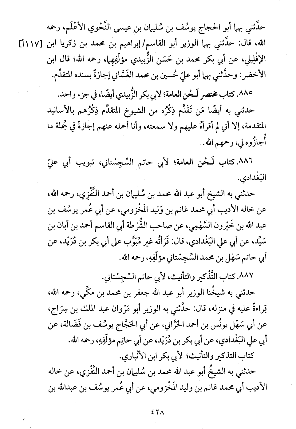 حدثني به الشيخ أبو عبد الله محمد بن سليمان بن أحمد النّفزي، رحمه الله، عن خاله الأديب أبي محمد غانم بن وليد المخزومي، عن أبي عمر يوسف بن عبد الله بن خيرون السّهمي، عن صاحب الشّرطة أبي القاسم أحمد بن أبان بن سيّد، عن أبي علي البغدادي، قال: قرأته غير مبوّب على أبي بكر بن دريد، عن أبي حاتم سهل بن محمد السّجستاني مؤلّفه، رحمه الله.