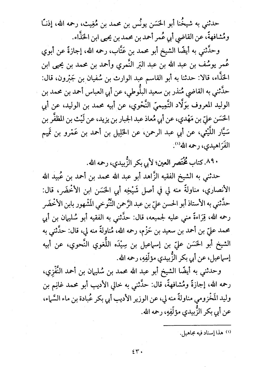 حدّثني به القاضي منذر بن سعيد البلّوطي، عن أبي العباس أحمد بن محمد بن الوليد المعروف بولاّد التّميميّ النّحوي، عن أبيه محمد بن الوليد، عن أبي الحسن عليّ بن مهدي، عن أبي معاذ عبد الجبار بن يزيد، عن ليث بن المظفّر بن سيّار اللّيثي، عن أبي عبد الرحمن، عن الخليل بن أحمد بن عمرو بن تميم الفراهيدي، رحمه الله (¬1).