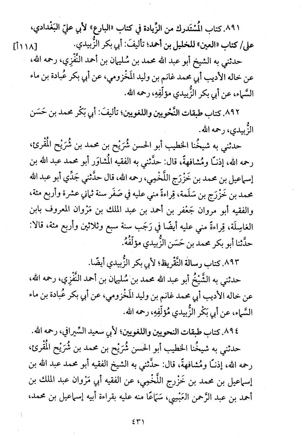 حدثني به الشيخ أبو عبد الله محمد بن سليمان بن أحمد النّفزي، رحمه الله، عن خاله الأديب أبي محمد غانم بن وليد المخزومي، عن أبي بكر عبادة بن ماء السّماء، عن أبي بكر الزّبيدي مؤلّفه، رحمه الله.