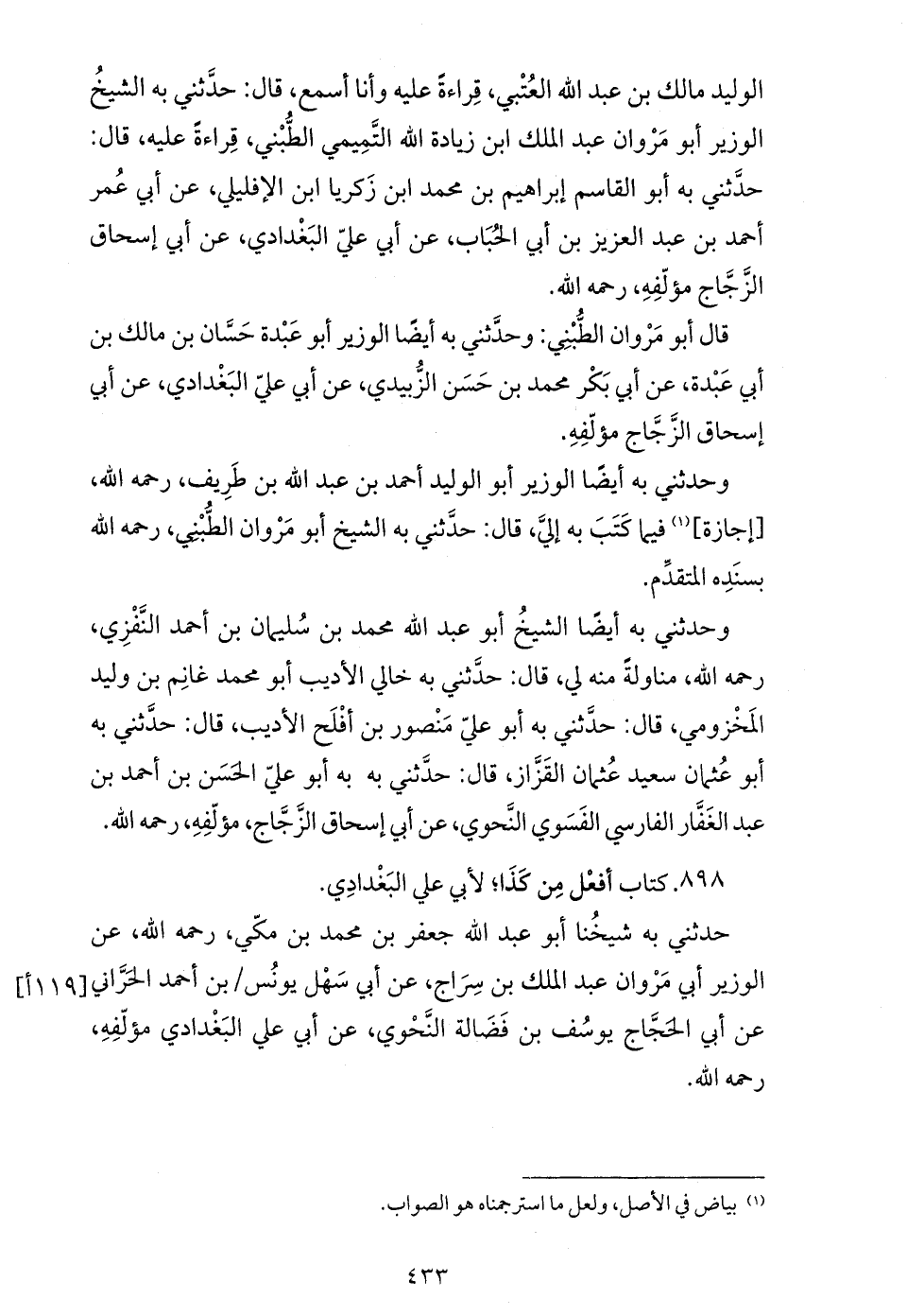 الوليد مالك بن عبد الله العتبي، قراءة عليه وأنا أسمع، قال: حدّثني به الشيخ الوزير أبو مروان عبد الملك ابن زيادة الله التّميمي الطّبني، قراءة عليه، قال: حدّثني به أبو القاسم إبراهيم بن محمد ابن زكريا ابن الإفليلي، عن أبي عمر أحمد بن عبد العزيز بن أبي الحباب، عن أبي عليّ البغدادي، عن أبي إسحاق الزّجّاج مؤلّفه، رحمه الله.