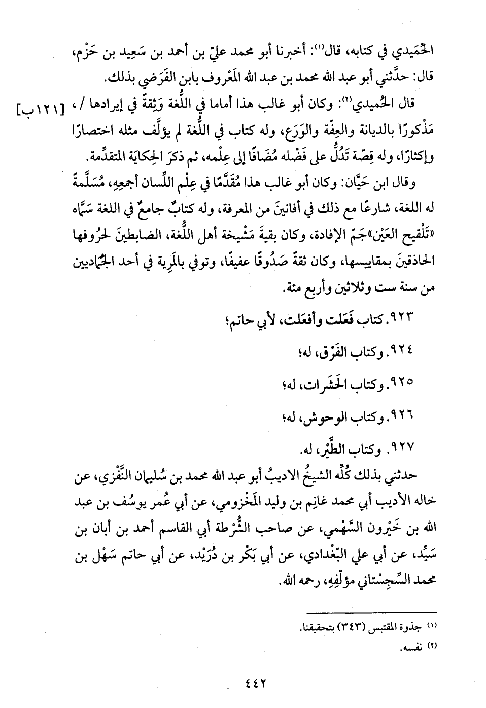 حدثني بذلك كلّه الشيخ الاديب أبو عبد الله محمد بن سليمان النّفزي، عن خاله الأديب أبي محمد غانم بن وليد المخزومي، عن أبي عمر يوسف بن عبد الله بن خيرون السّهمي، عن صاحب الشّرطة أبي القاسم أحمد بن أبان بن سيّد، عن أبي علي البّغدادي، عن أبي بكر بن دريد، عن أبي حاتم سهل بن محمد السّجستاني مؤلّفه، رحمه الله.