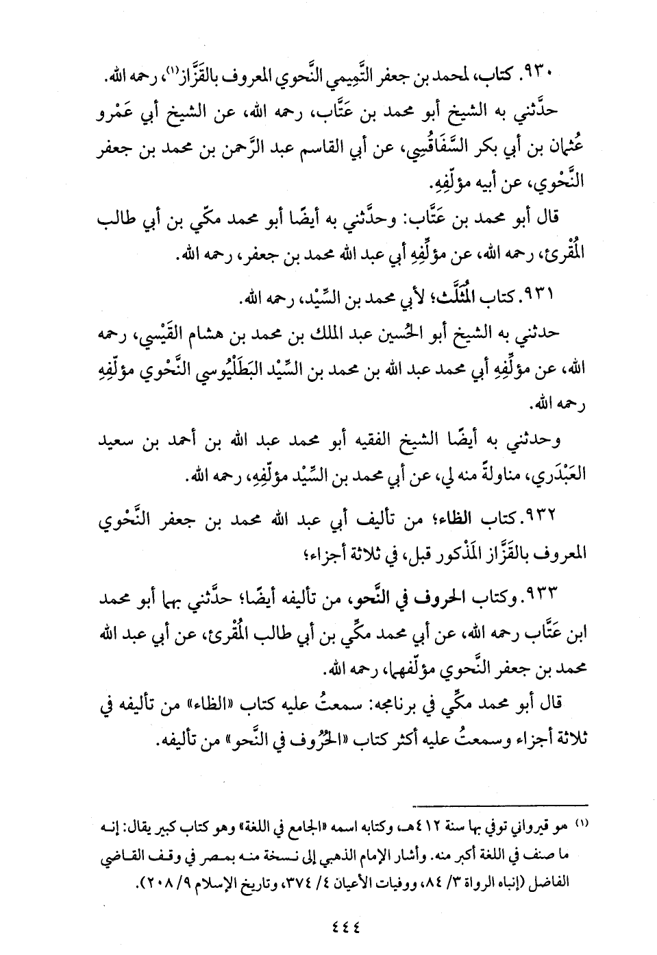 حدّثني بهما أبو محمد ابن عتّاب رحمه الله، عن أبي محمد مكّي بن أبي طالب المقرئ، عن أبي عبد الله محمد بن جعفر النّحوي مؤلّفهما، رحمه الله.