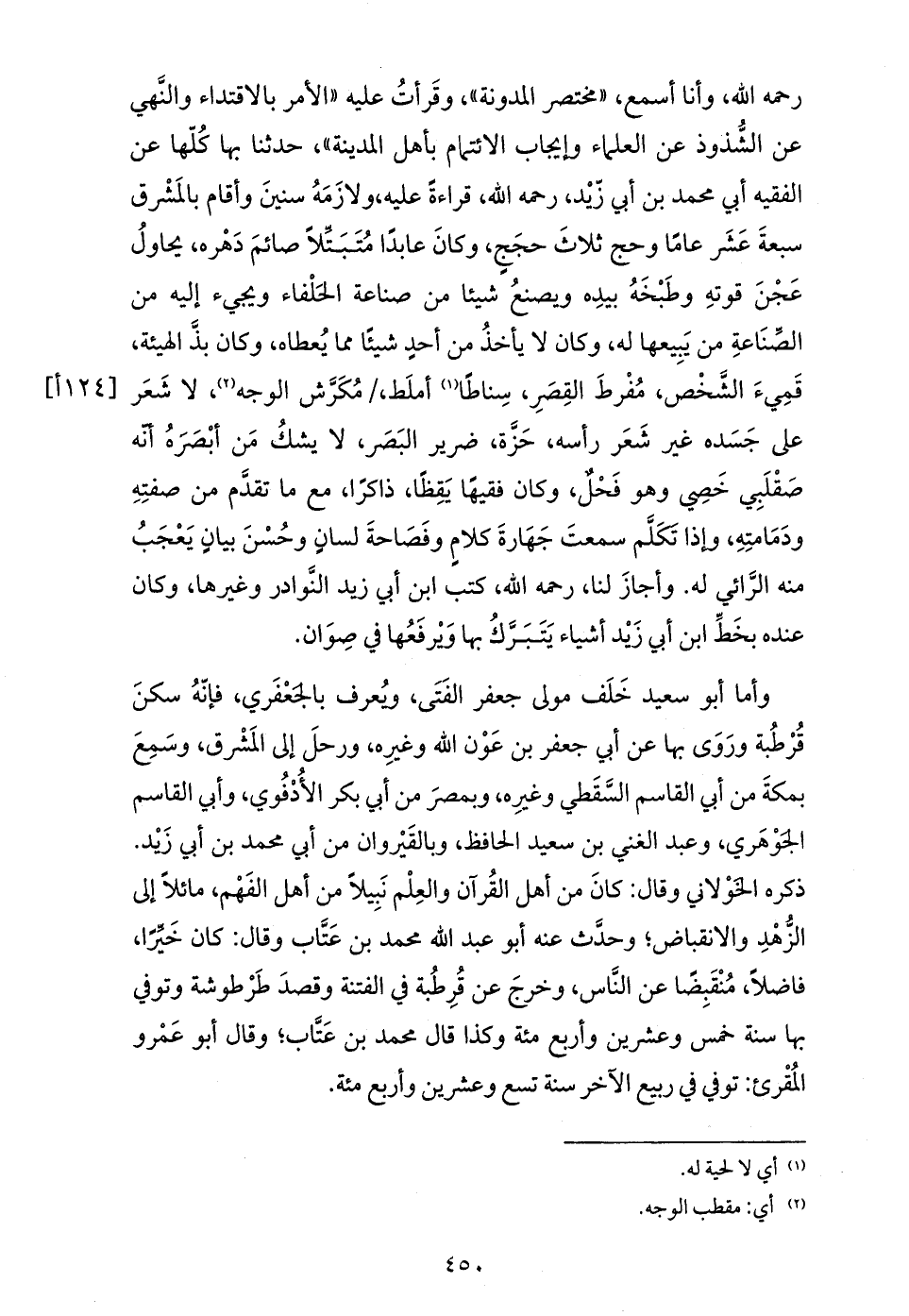 رحمه الله، وأنا أسمع، «مختصر المدونة»، وقرأت عليه «الأمر بالاقتداء والنّهي عن الشّذوذ عن العلماء وإيجاب الائتمام بأهل المدينة»، حدثنا بها كلّها عن الفقيه أبي محمد بن أبي زّيد، رحمه الله، قراءة عليه، ولازمه سنين وأقام بالمشرق سبعة عشر عاما وحج ثلاث حجج، وكان عابدا متبتّلا صائم دهره، يحاول عجن قوته وطبخه بيده ويصنع شيئا من صناعة الحلفاء ويجيء إليه من الصّناعة من يبيعها له، وكان لا يأخذ من أحد شيئا مما يعطاه، وكان بذّ الهيئة، قميء الشّخص، مفرط القصر، سناطا (¬1) أملط، / مكرّش الوجه (¬2)، لا شعر على جسده غير شعر رأسه، حزّة، ضرير البصر، لا يشك من أبصره أنّه صقلبي خصي وهو فحل، وكان فقيها يقظا، ذاكرا، مع ما تقدّم من صفته ودمامته، وإذا تكلّم سمعت جهارة كلام وفصاحة لسان وحسن بيان يعجب منه الرّائي له. وأجاز لنا، رحمه الله، كتب ابن أبي زيد النّوادر وغيرها، وكان عنده بخطّ ابن أبي زيد أشياء يتبرّك بها ويرفعها في صوان.