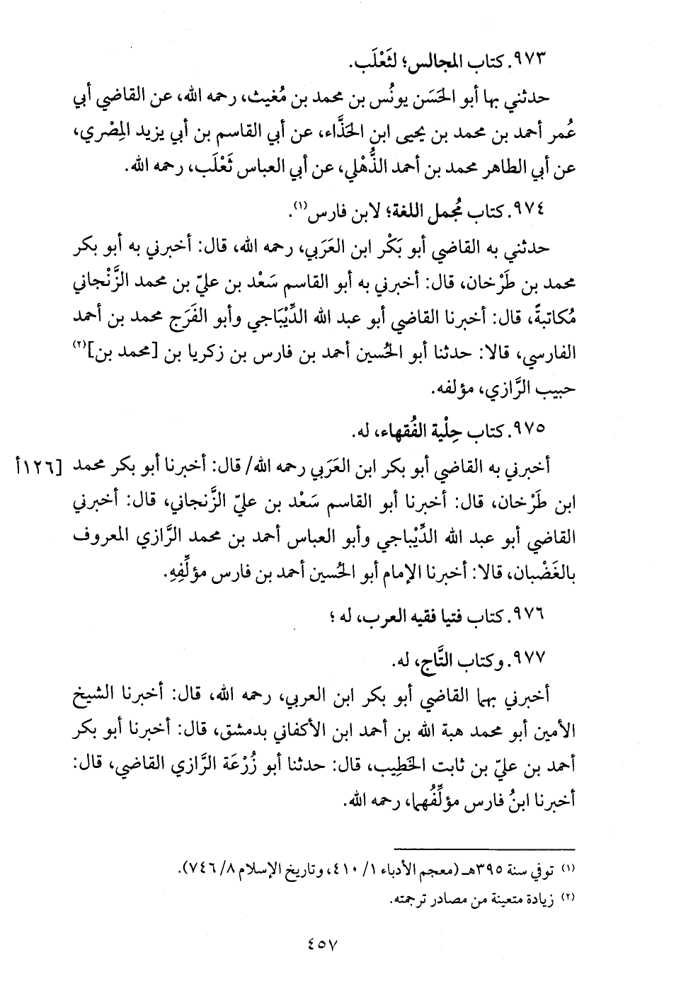 أخبرني بهما القاضي أبو بكر ابن العربي، رحمه الله، قال: أخبرنا الشيخ الأمين أبو محمد هبة الله بن أحمد ابن الأكفاني بدمشق، قال: أخبرنا أبو بكر أحمد بن عليّ بن ثابت الخطيب، قال: حدثنا أبو زرعة الرّازي القاضي، قال: أخبرنا ابن فارس مؤلّفهما، رحمه الله.