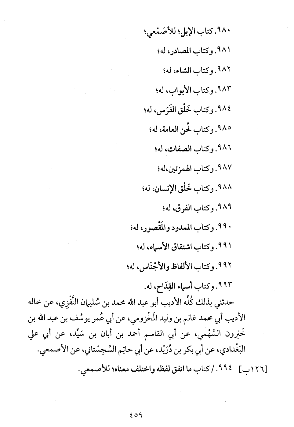 حدثني بذلك كلّه الأديب أبو عبد الله محمد بن سليمان النّفزي، عن خاله الأديب أبي محمد غانم بن وليد المخزومي، عن أبي عمر يوسف بن عبد الله بن خيرون السّهمي، عن أبي القاسم أحمد بن أبان بن سيّد، عن أبي علي البغدادي، عن أبي بكر بن دريد، عن أبي حاتم السّجستاني، عن الأصمعي.