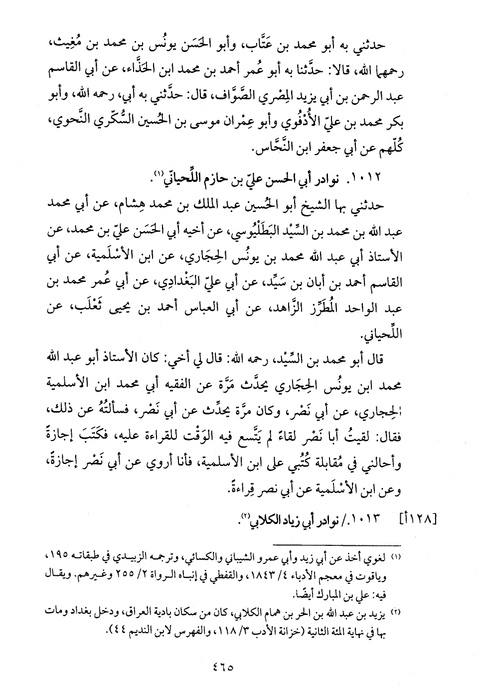 حدثني بها الشيخ أبو الحسين عبد الملك بن محمد هشام، عن أبي محمد عبد الله بن محمد بن السّيد البطليوسي، عن أخيه أبي الحسن عليّ بن محمد، عن الأستاذ أبي عبد الله محمد بن يونس الحجاري، عن ابن الأسلمية، عن أبي القاسم أحمد بن أبان بن سيّد، عن أبي عليّ البغدادي، عن أبي عمر محمد بن عبد الواحد المطرّز الزّاهد، عن أبي العباس أحمد بن يحيى ثعلب، عن اللّحياني.