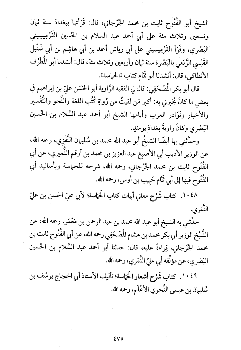 وحدّثني بها أيضا الشيخ أبو عبد الله محمد بن سليمان النّفزي، رحمه الله، عن الوزير الأديب أبي الأصبغ عبد العزيز بن محمد بن أرقم النّميري، عن أبي الفتوح ثابت بن محمد الجرجاني، رحمه الله، شرحه للحماسة وبأسانيد أبي الفتوح فيها إلى أبي تمّام حبيب بن أوس، رحمه الله.