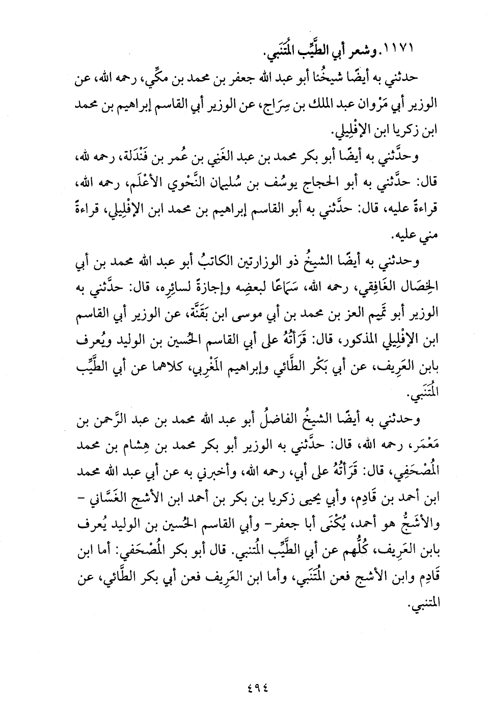 وحدثني به أيضا الشيخ ذو الوزارتين الكاتب أبو عبد الله محمد بن أبي الخصال الغافقي، رحمه الله، سماعا لبعضه وإجازة لسائره، قال: حدّثني به الوزير أبو تميم العز بن محمد بن أبي موسى ابن بقنّة، عن الوزير أبي القاسم ابن الإفليلي المذكور، قال: قرأته على أبي القاسم الحسين بن الوليد ويعرف بابن العريف، عن أبي بكر الطّائي وإبراهيم المغربي، كلاهما عن أبي الطّيّب المتنبي.