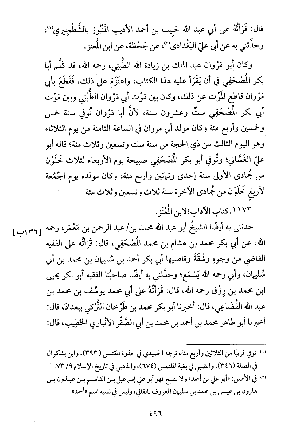 قال: قرأته على أبي عبد الله حبيب بن أحمد الأديب المنبوز بالشّطجيري (¬1)، وحدّثني به عن أبي عليّ البغدادي (¬2)، عن جحظة، عن ابن المعتز.