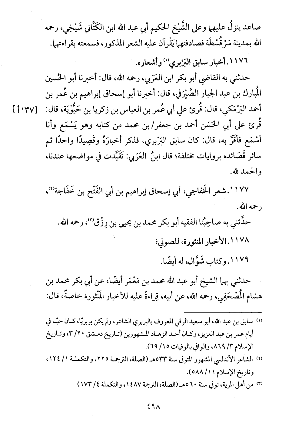 حدثني به القاضي أبو بكر ابن العربي، رحمه الله، قال: أخبرنا أبو الحسين المبارك بن عبد الجبار الصّيرفي، قال: أخبرنا أبو إسحاق إبراهيم بن عمر بن أحمد البرمكي، قال: قرئ علي أبي عمر بن العباس بن زكريا بن حيّوية، قال: قرئ على أبي الحسن أحمد بن جعفر / بن محمد من كتابه وهو يسمع وأنا أسمع فأقرّ به، قال: كان سابق البربري، فذكر أخباره وقصيدا واحدا ثم سائر قصائده بروايات مختلفة؛ قال ابن العربي: تقيّدت في مواضعها عندنا، والحمد لله.