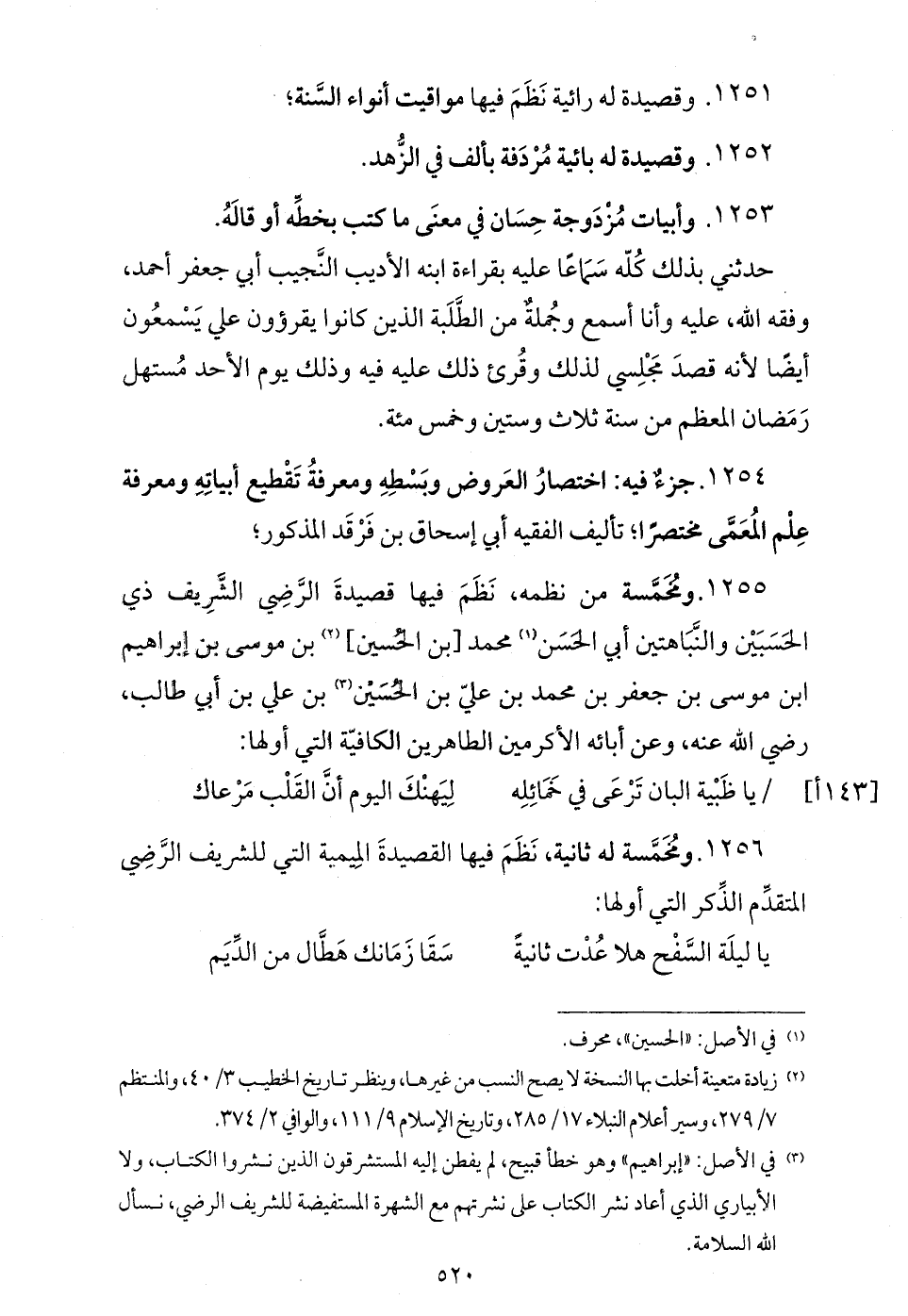 نظم فيها قصيدة الرّضي الشّريف ذي الحسبين والنّباهتين أبي الحسن (¬1) محمد [بن الحسين] (¬2) بن موسى بن إبراهيم ابن موسى بن جعفر بن محمد بن عليّ بن الحسين (¬3) بن علي بن أبي طالب، رضي الله عنه، وعن أبائه الأكرمين الطاهرين الكافيّة التي أولها: