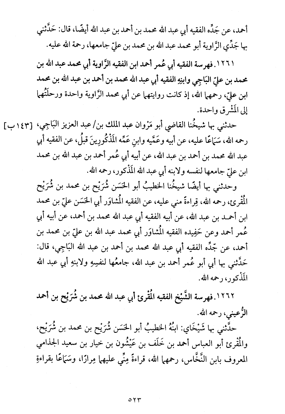1261. فهرسة الفقيه أبي عمر أحمد ابن الفقيه الرّاوية أبي محمد عبد الله بن محمد بن عليّ الباجي وابنه الفقيه أبي عبد الله محمدبن أحمد بن عبد الله بن محمد بن عليّ، رحمهما الله، إذ كانت روايتهما عن أبي محمد الرّاوية واحدة ورحلتهما إلى المشرق واحدة.