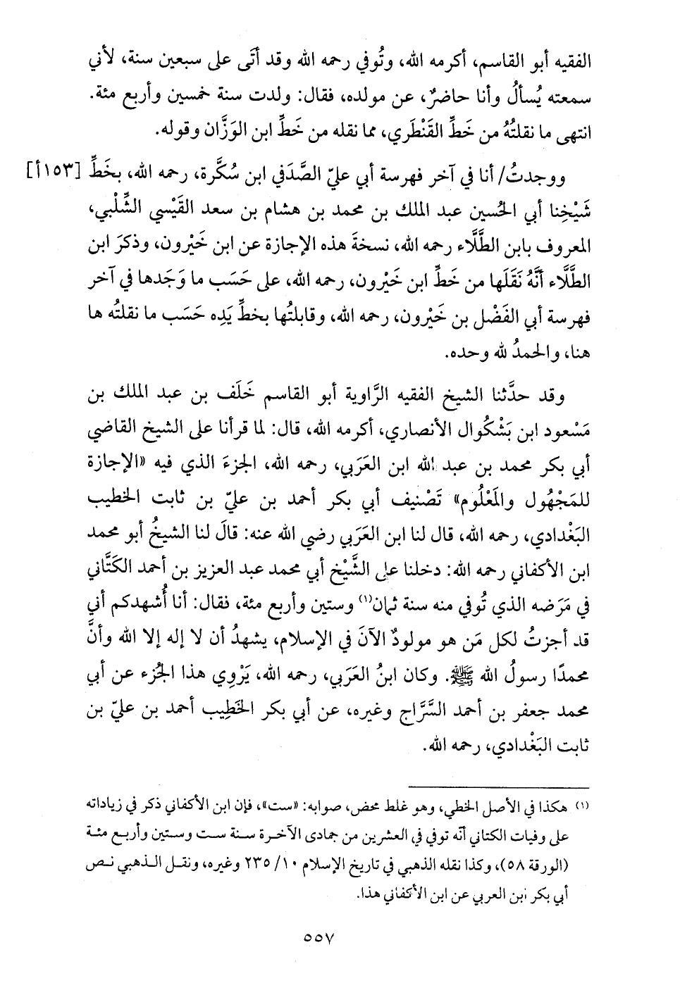 (¬1) هكذا في الأصل الخطي، وهو غلط محض، صوابه: «ست»، فإن ابن الأكفاني ذكر في زياداته على وفيات الكتاني أنّه توفي في العشرين من جمادى الآخرة سنة ست وستين وأربع مئة (الورقة 58)، وكذا نقله الذهبي في تاريخ الإسلام 10/ 235 وغيره، ونقل الذهبي نص أبي بكر ابن العربي عن ابن الأكفاني هذا.