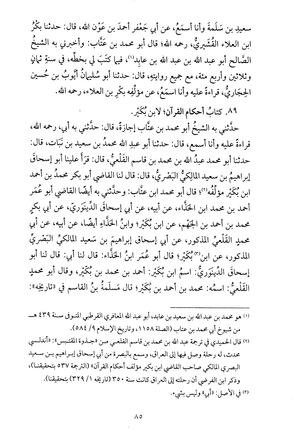 (¬2) قال الحميدي في ترجمة عبد الله بن محمد بن قاسم القلعي من «جذوة المقتبس»: «أندلسي محدث، له رحلة وصل فيها إلى العراق، وسمع بالبصرة من أبي إسحاق إبراهيم بن سعيد البصري المالكي صاحب القاضي ابن بكير مؤلف أحكام القرآن» (الترجمة 537 بتحقيقنا)، وذكر ابن الفرضي أن رحلته إلى العراق كانت سنة 350 (تاريخه 1/ 329) بتحقيقنا).