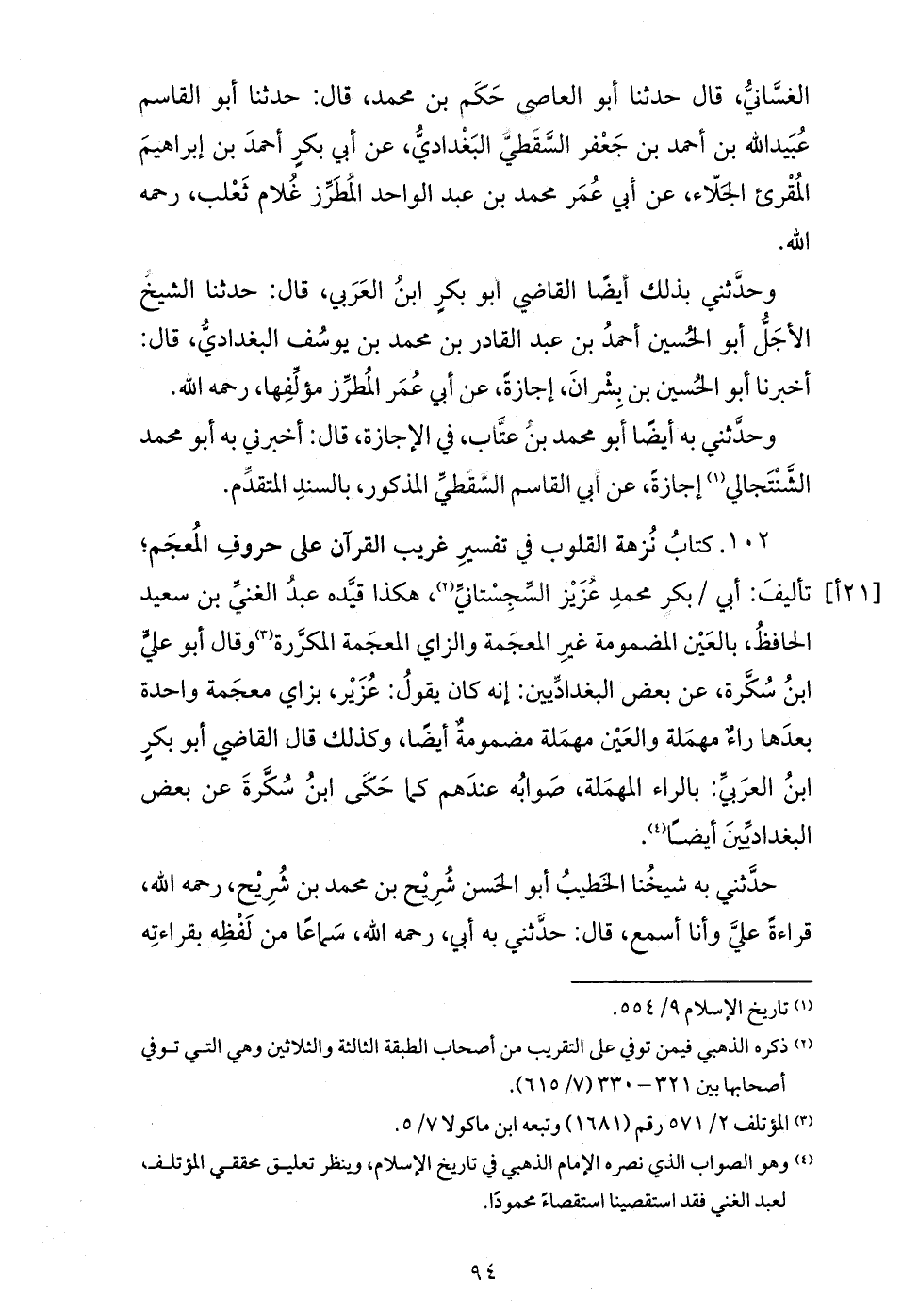 الغسّانيّ، قال حدثنا أبو العاصي حكم بن محمد، قال: حدثنا أبو القاسم عبيد الله بن أحمد بن جعفر السّقطيّ البغداديّ، عن أبي بكر أحمد بن إبراهيم المقرئ الجلاّء، عن أبي عمر محمد بن عبد الواحد المطرّز غلام ثعلب، رحمه الله.