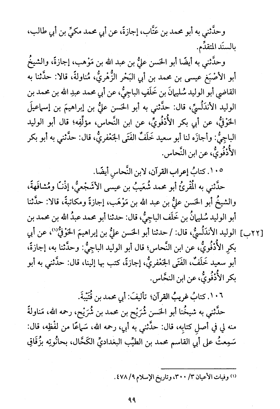 حدّثني به المقرئ أبو محمد شعيب بن عيسى الأشجعيّ، إذنا ومشافهة، والشيخ أبو الحسن عليّ بن عبد الله بن موهب، إجازة ومكاتبة، قالا: حدّثنا أبو الوليد سليمان بن خلف الباجيّ، قال: حدثنا أبو محمد عبد الله بن محمد بن [22 ب] الوليد الأندلسيّ، قال: / حدثنا أبو الحسن عليّ بن إبراهيم الحوفيّ (¬1)، عن أبي بكر الأدفويّ، عن ابن النّحاس؛ قال أبو الوليد الباجيّ: وحدّثنا به، إجازة، أبو سعيد خلف، الفتى الجعفريّ، إجازة، كتب بها إلينا، قال: حدّثني به أبو بكر الأدفويّ، عن ابن النّحاس.