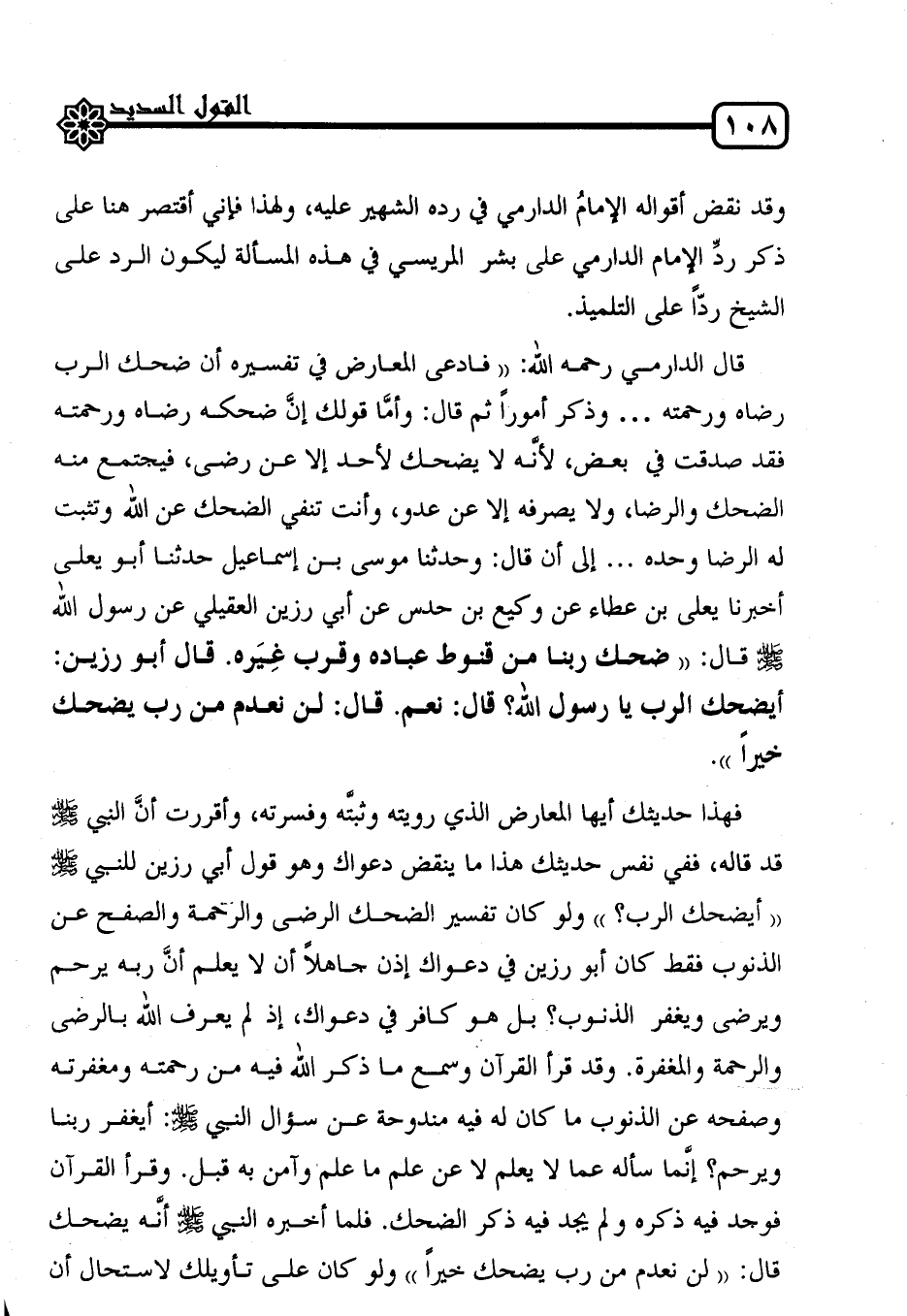 فهذا حديثك أيها المعارض الذي رويته وثبتَّه وفسرته، وأقررت أنَّ النبي صلى الله عليه وسلم قد قاله، ففي نفس حديثك هذا ما ينقض دعواك وهو قول أبي رزين للنبي صلى الله عليه وسلم "أيضحك الرب؟ " ولو كان تفسير الضحك الرضى والرحمة والصفح عن الذنوب فقط كان أبو رزين في دعواك إذن جاهلاً أن لا يعلم أنَّ ربه يرحم ويرضى ويغفر الذنوب؟ بل هو كافر في دعواك، إذ لم يعرف الله بالرضى والرحمة والمغفرة. وقد قرأ القرآن وسمع ما ذكر الله فيه من رحمته ومغفرته وصفحه عن الذنوب ما كان له فيه مندوحة عن سؤال النبي صلى الله عليه وسلم: أيغفر ربنا ويرحم؟ إنَّما سأله عما لا يعلم لا عن علم ما علم وآمن به قبل. وقرأ القرآن فوجد فيه ذكره ولم يجد فيه ذكر الضحك. فلما أخبره النبي صلى الله عليه وسلم أنَّه يضحك قال: "لن نعدم من رب يضحك خيراً" ولو كان على تأويلك لاستحال أن
