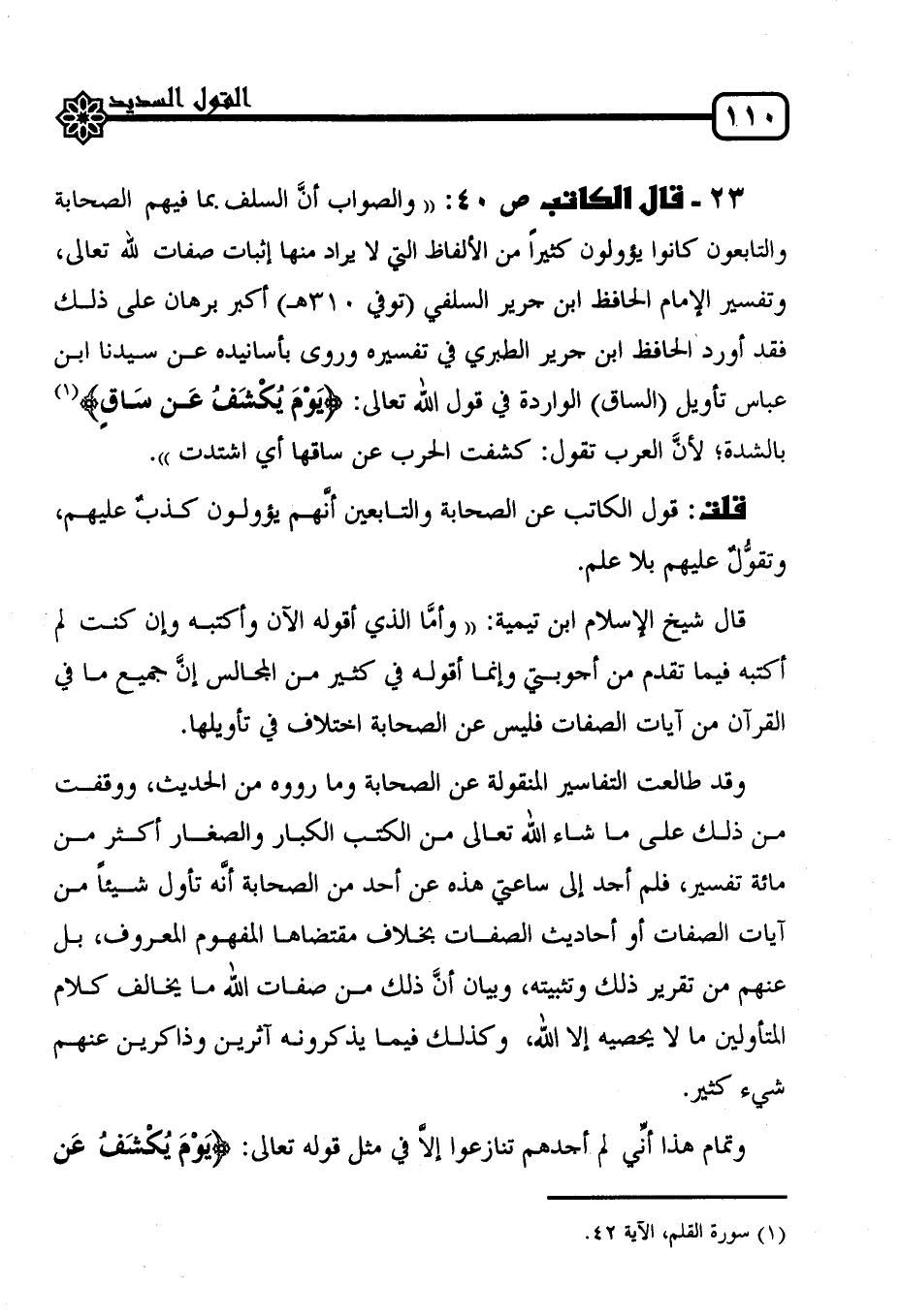 23 قال الكاتب ص 40: "والصواب أنَّ السلف بما فيهم الصحابة والتابعون كانوا يؤولون كثيراً من الألفاظ التي لا يراد منها إثبات صفات لله تعالى، وتفسير الإمام الحافظ ابن جرير السلفي (توفي 310هـ) أكبر برهان على ذلك فقد أورد الحافظ ابن جرير الطبري في تفسيره وروى بأسانيده عن سيدنا ابن عباس تأويل (الساق) الواردة في قول الله تعالى: {يَوْمَ يُكْشَفُ عَن سَاقٍ} 1 بالشدة؛ لأنَّ العرب تقول: كشفت الحرب عن ساقها أي اشتدت".