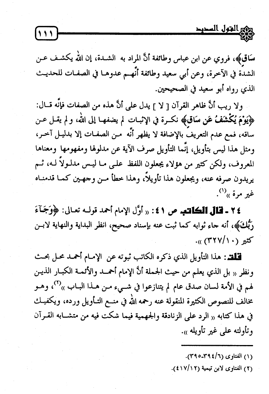 ولا ريب أنَّ ظاهر القرآن [لا] يدل على أنَّ هذه من الصفات فإنَّه قال: {يَوْمَ يُكْشَفُ عَن سَاقٍ} نكرة في الإثبات لم يضفها إلى الله، ولم يقل عن ساقه، فمع عدم التعريف بالإضافة لا يظهر أنَّه من الصفات إلا بدليل آخر، ومثل هذا ليس بتأويل، إنَّما التأويل صرف الآية عن مدلولها ومفهومها ومعناها المعروف، ولكن كثير من هؤلاء يجعلون اللفظ على ما ليس مدلولاً له، ثم يريدون صرفه عنه، ويجعلون هذا تأويلاً، وهذا خطأ من وجهين كما قدمناه غير مرة"1.
