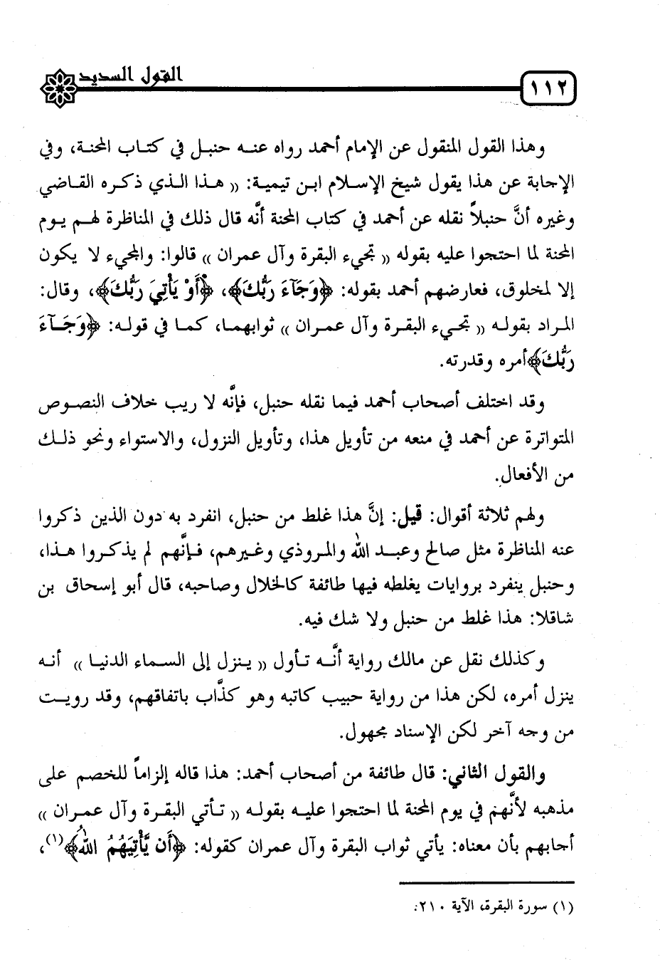 والقول الثاني: قال طائفة من أصحاب أحمد: هذا قاله إلزاماً للخصم على مذهبه لأنَّهم في يوم المحنة لما احتجوا عليه بقوله "تأتي البقرة وآل عمران" أجابهم بأن معناه: يأتي ثواب البقرة وآل عمران كقوله: {أَن يَّأْتِيَهُمُ اللهُ} 1،