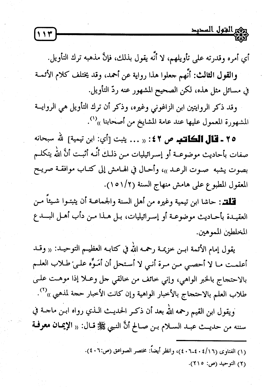 25 قال الكاتب ص 42: "… يثبت [أي: ابن تيمية] لله سبحانه صفات بأحاديث موضوعة أو إسرائيليات من ذلك أنَّه أثبت أنَّ الله يتكلم بصوت يشبه صوت الرعد"، وأحال في الهامش إلى كتاب موافقة صريح المعقول المطبوع على هامش منهاج السنة (2/151) .