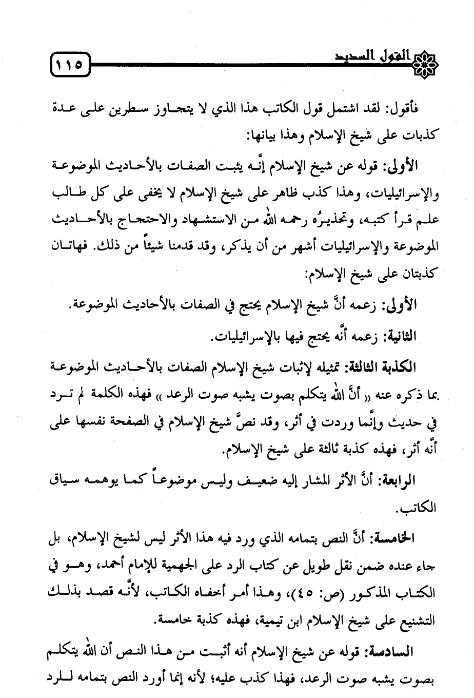 الكذبة الثالثة: تمثيله لإثبات شيخ الإسلام الصفات بالأحاديث الموضوعة بما ذكره عنه "أنَّ الله يتكلم بصوت يشبه صوت الرعد" فهذه الكلمة لم ترد في حديث وإنَّما وردت في أثر، وقد نصَّ شيخ الإسلام في الصفحة نفسها على أنَّه أثر، فهذه كذبة ثالثة على شيخ الإسلام.