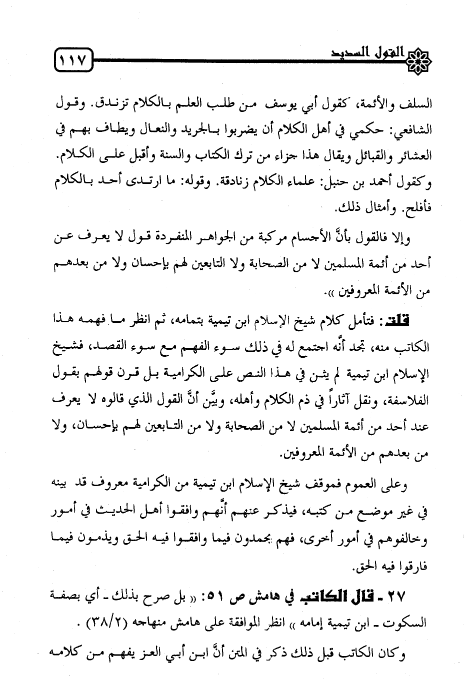 27 قال الكاتب في هامش ص 51: "بل صرح بذلك أي بصفة السكوت ابن تيمية إمامه" انظر الموافقة على هامش منهاجه (2/38) .