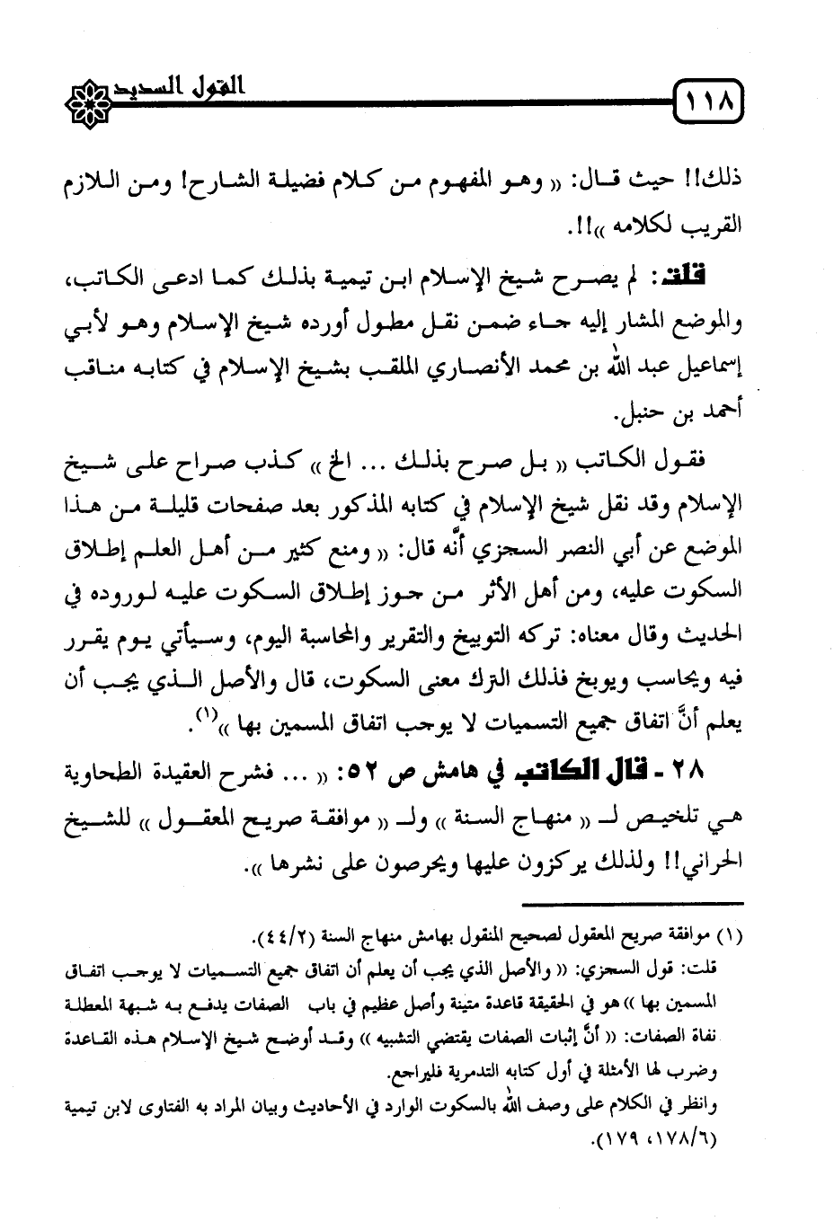 28 قال الكاتب في هامش ص 52: " ... فشرح العقيدة الطحاوية هي تلخيص ل "منهاج السنة" ول "موافقة صريح المعقول" للشيخ الحراني!! ولذلك يركزون عليها ويحرصون على نشرها".