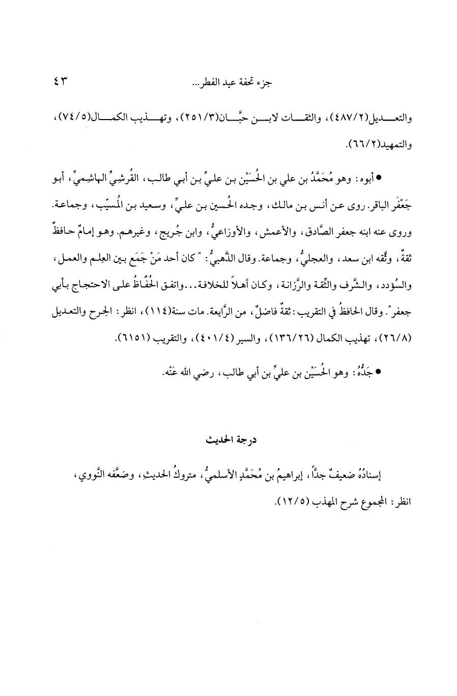 إسنادُهُ ضعيفٌ جدَّاً، إبراهيمُ بن مُحَمَّدٍ الأسلميُّ، متروكُ الحديثِ، وضعَّفه النَّووي، انظر: المجموع شرح المهذب (5/ 12).